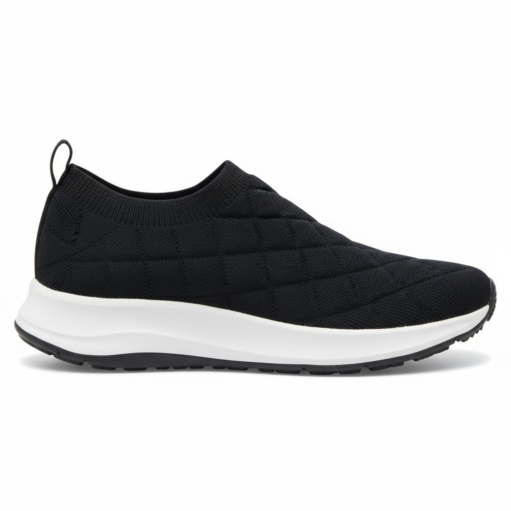 Elevate your autumn wardrobe with these Fitflop F-Mode Flow Quilted-Knit Slip-On Sneakers in sleek black. Designed with a refined quilted-knit upper, they offer a sophisticated blend of comfort and style for everyday wear. The slip-on design ensures effortless convenience, while the cushioned sole provides lasting support through all your fall activities. Perfect for those who appreciate understated elegance combined with practical functionality.