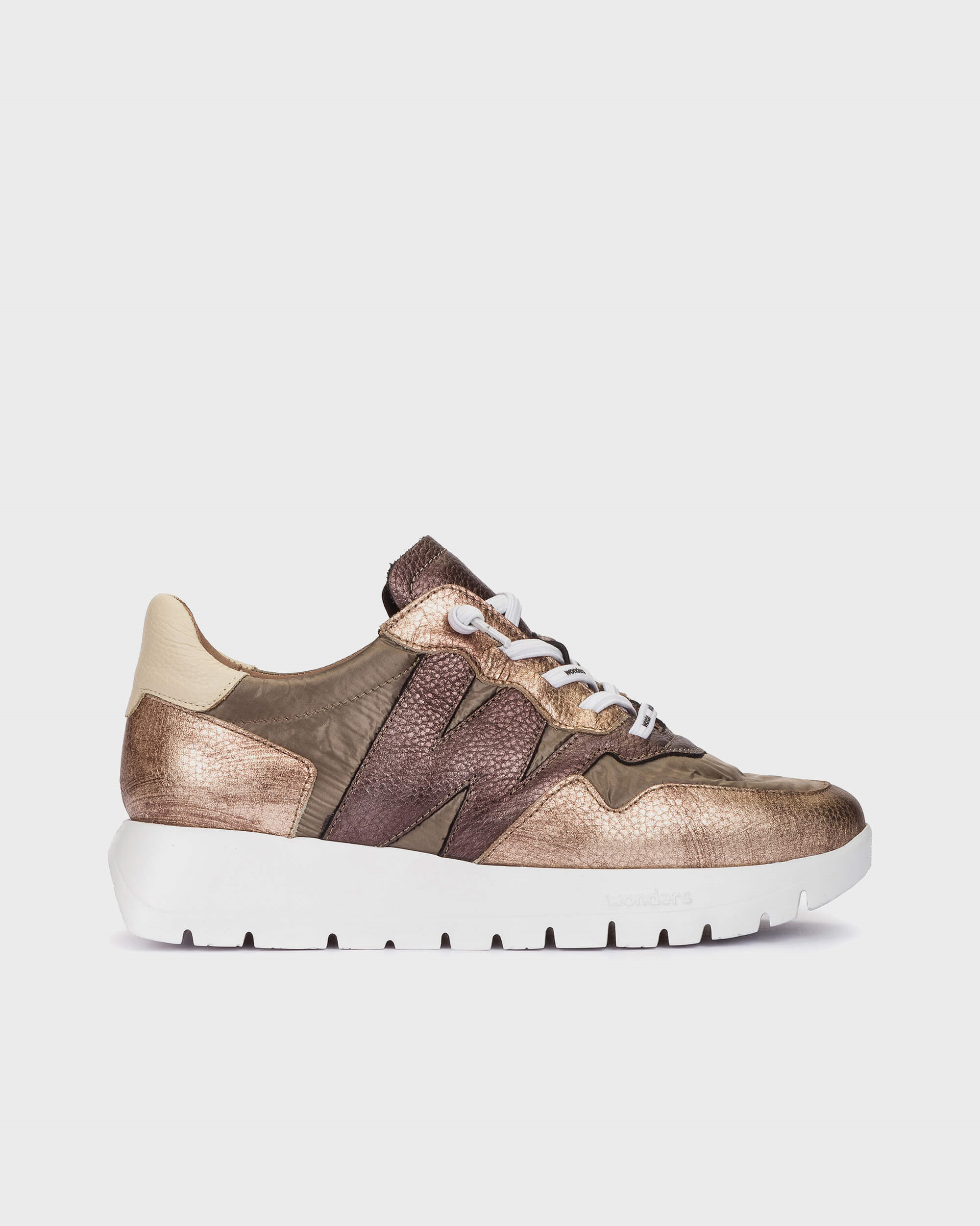 Step into the Wonders A-2491 Bronze Metallic Trainer, where extreme comfort meets playful style. This neutral shoe adds just the right amount of pizzazz with its shimmering bronze metallic finish, making it perfect for fall adventures. Whether you're exploring new cities or strolling through your favorite spots, these trainers keep your feet happy and your look effortlessly chic. Ideal for travel, they blend versatility with a touch of sparkle to brighten every step.
