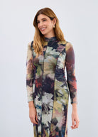 Not your typical garden party. This midi-length dress features a crinkled mesh texture and an abstract floral print in deep, expressive tones—an original design by a local artist that brings the drama (in the best way).