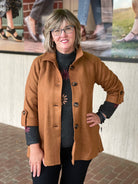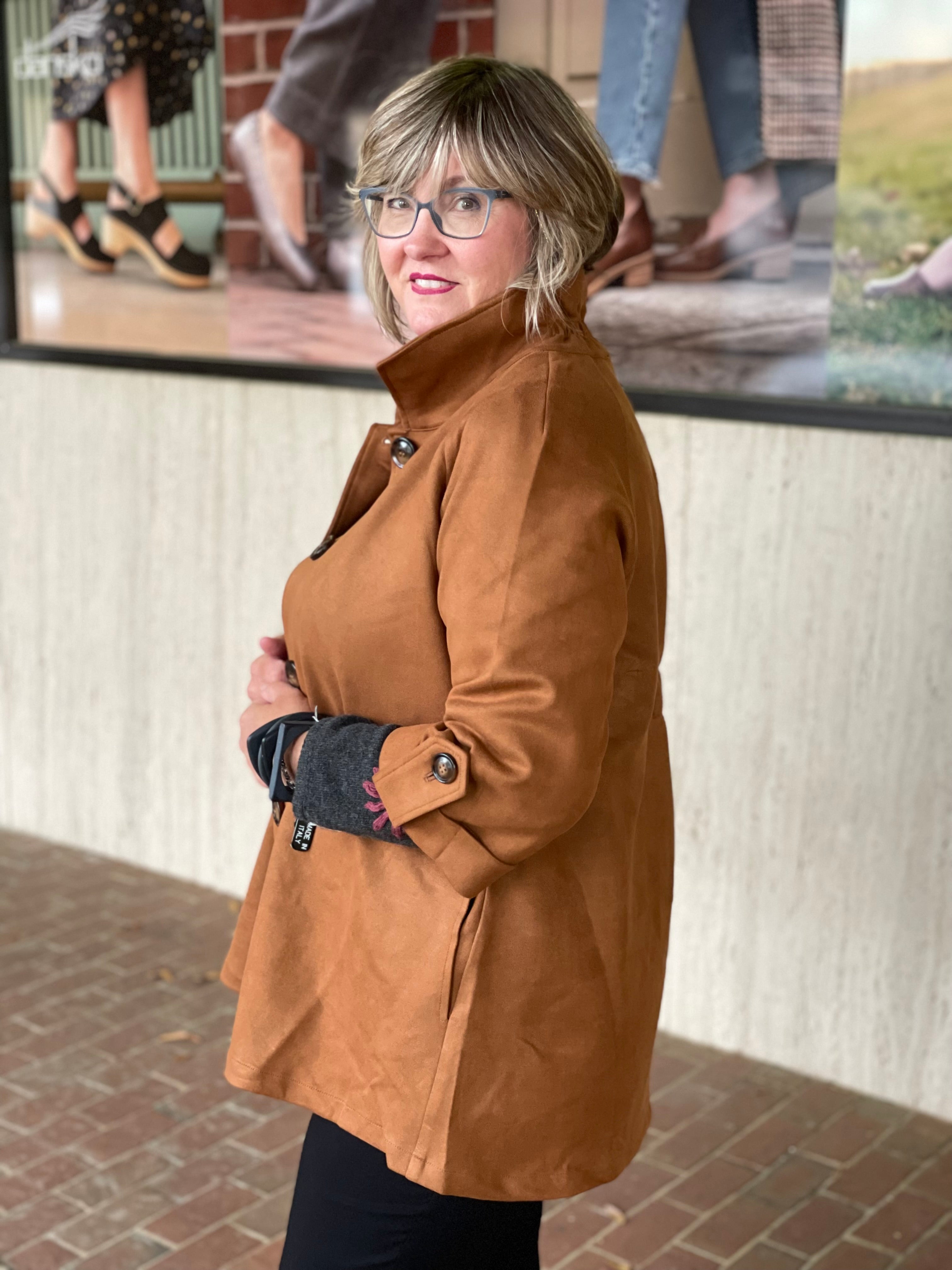 Meet our new best seller: the Boho Chic 761017 Jacket. Crafted from soft faux suede, it fits like a dream and features charming larger buttons and a cute gathered detail in the back. With 3/4 length sleeves, this jacket is as elegant as it is easy to wear—perfect for adding a playful twist to your everyday style.