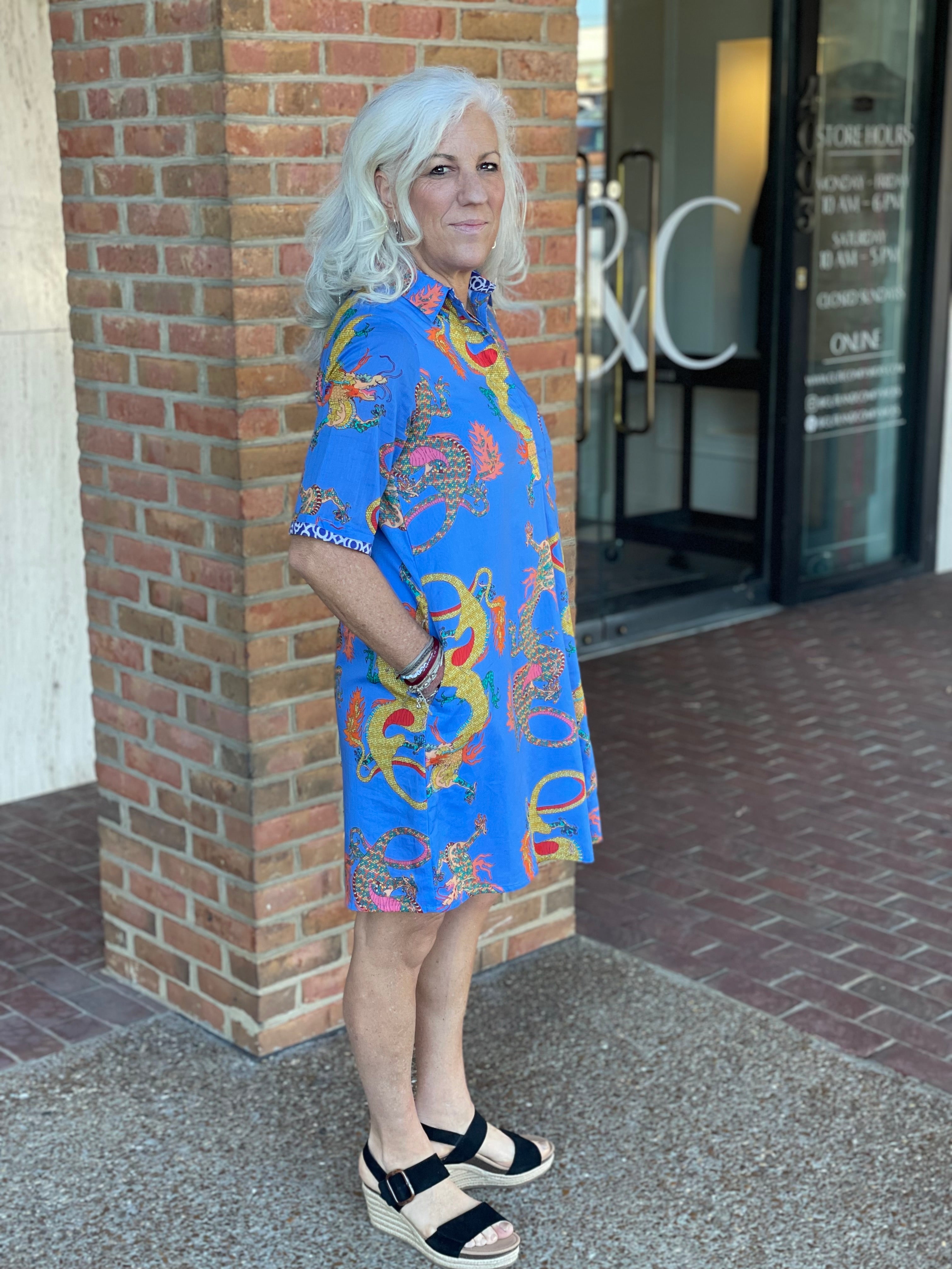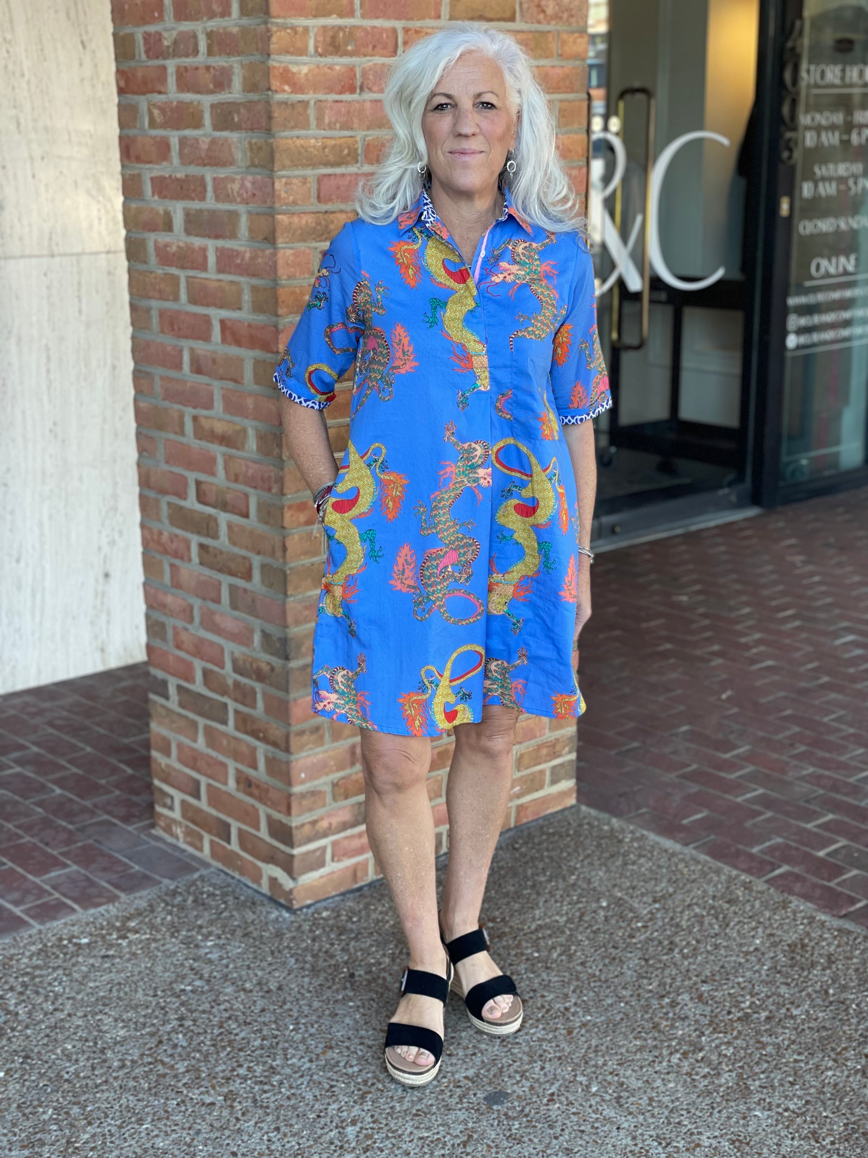 The Monterey Dress captures timeless elegance with its enchanting dragon print against a French blue ground. Crafted from lightweight cotton voile, this piece drapes beautifully while maintaining breathable comfort for all-day wear. The sophisticated print adds an artistic dimension to your wardrobe, making it equally suited for refined casual occasions or elevated gatherings. Perfect for those who appreciate distinctive design with understated luxury.