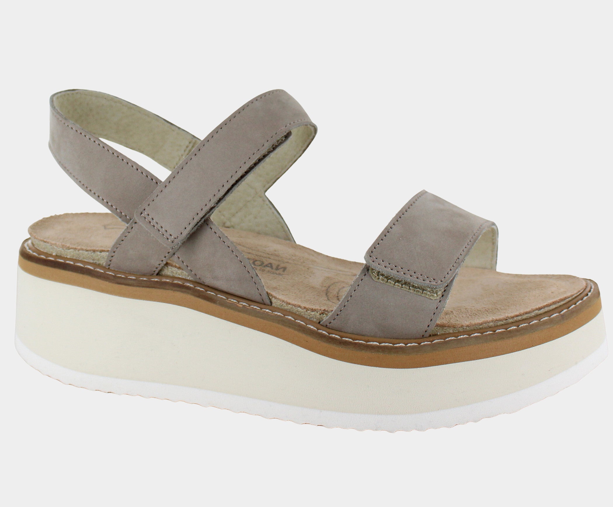 | The Meringue is a comfortable sandal with a sleek design contrasting underlay. Its double hook and loop straps allow for easy on/off. Naot's anatomic cork & latex footbed is wrapped in a pampering suede and molds to the shape of the foot with wear. |