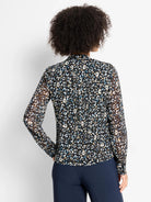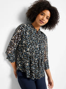 Elevate your collared look with this unique tucked top and delivers a key update to classic animal print. Namesake vertical tucks create a uniquely feminine shape that's perfect for work or going out, adding just the right amount of flair to your everyday ensemble. The adjustable cuffs allow for versatile styling options, and the blue and black mélange means she pairs perfectly with both denim and work pants.