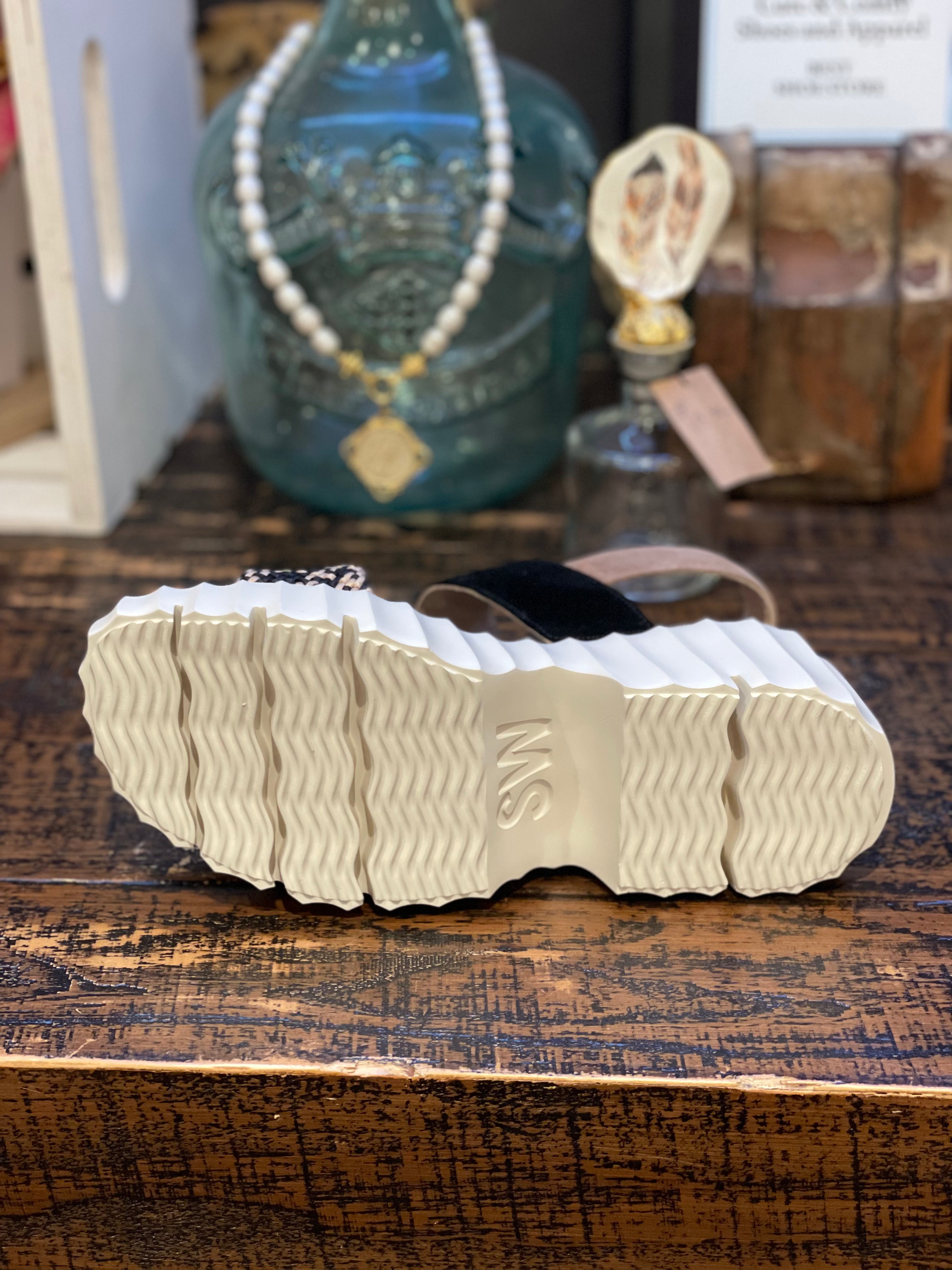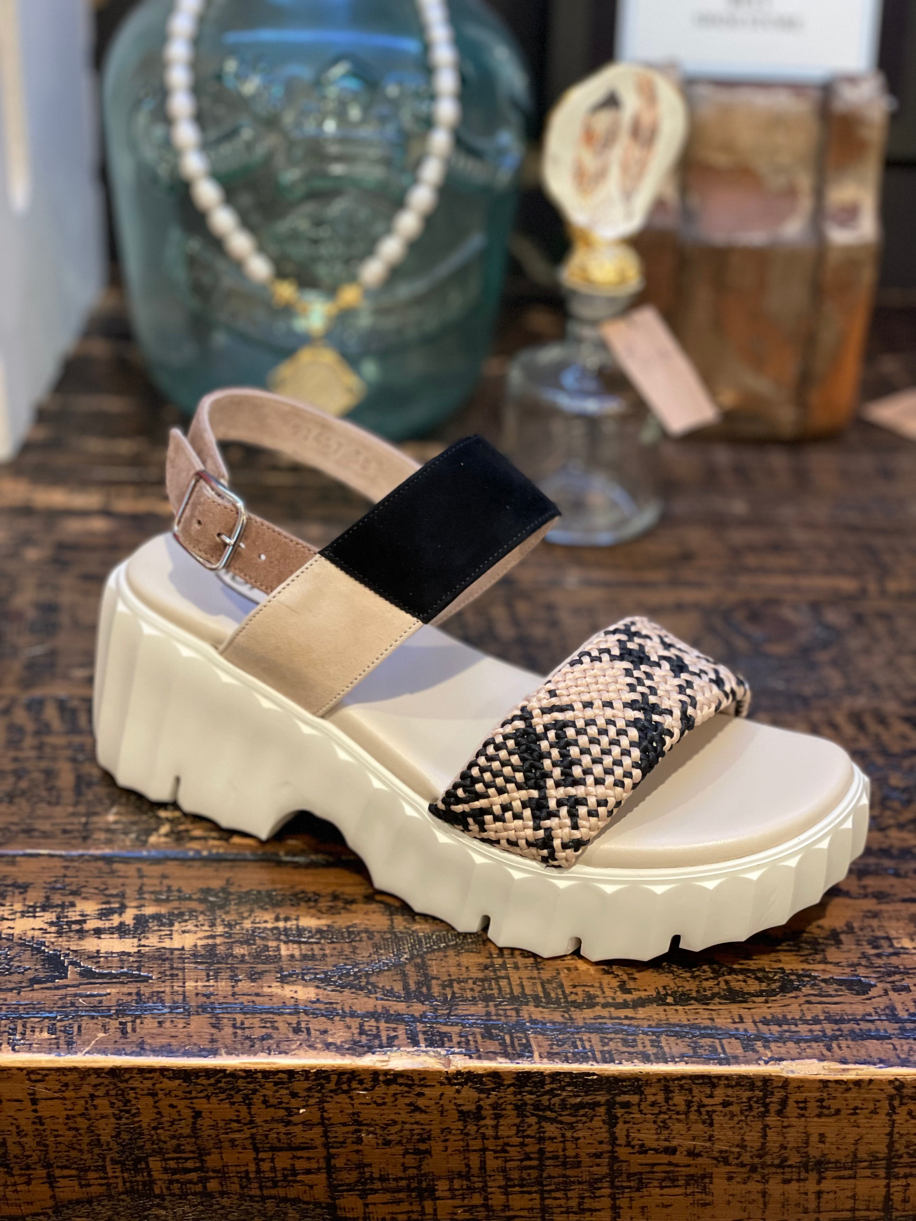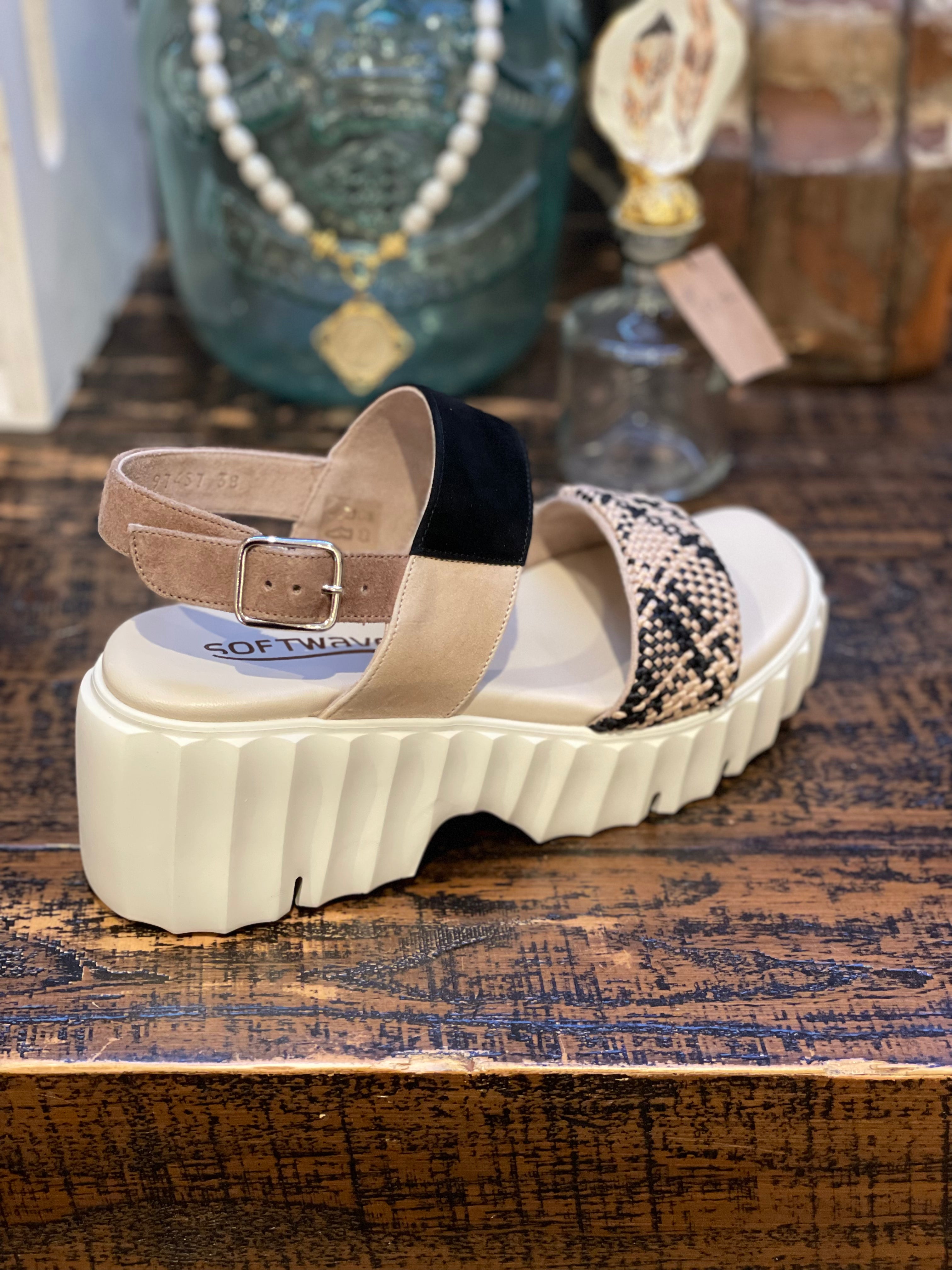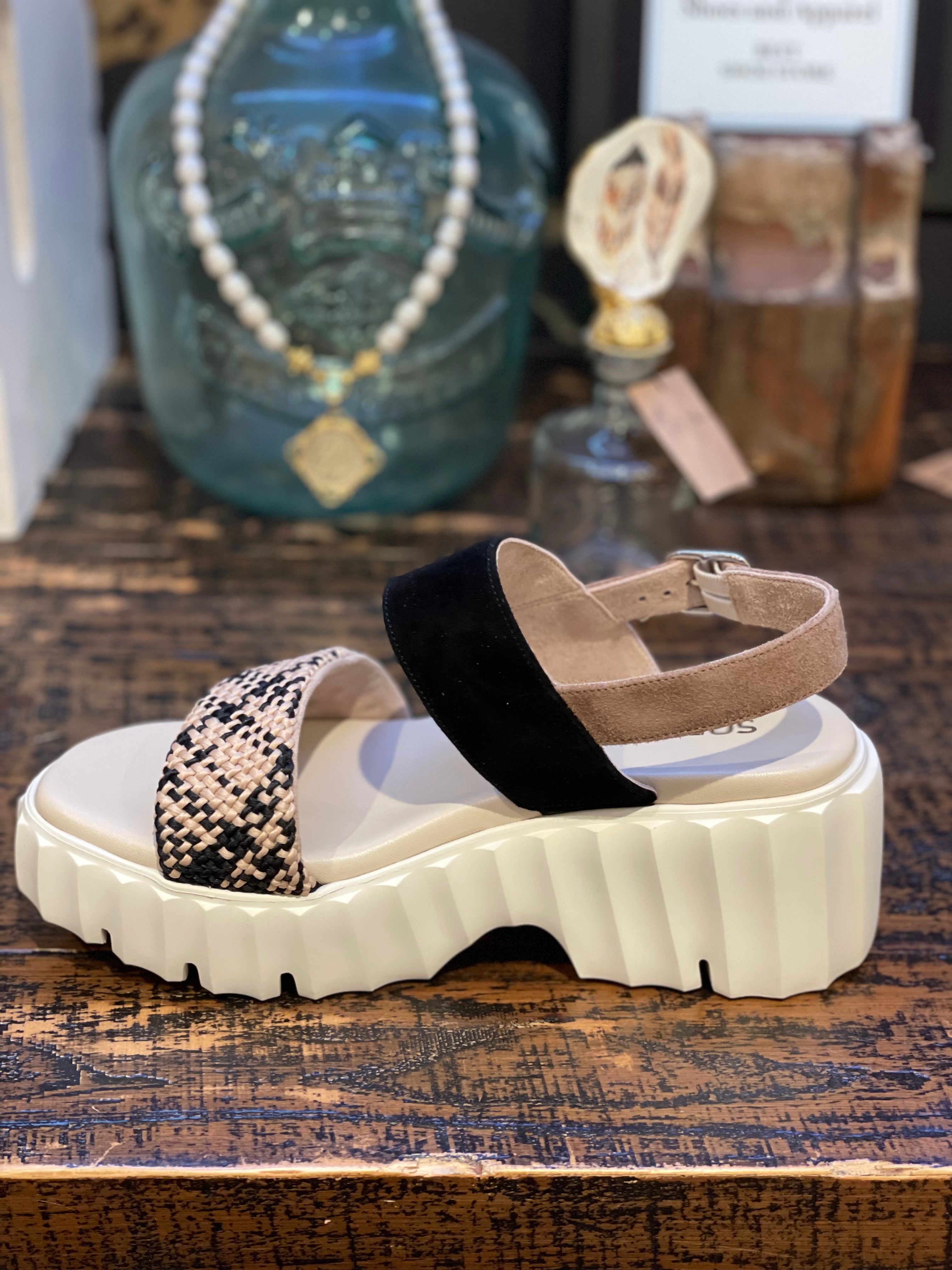 Elevate your style with the Softwaves 9.17.06 Maris Sandal. Featuring a black and tan rafia design, this sandal offers a neutral color block and a comfortable wedge stack heel. Perfect for those with wider feet, and made in Portugal for quality you can trust.