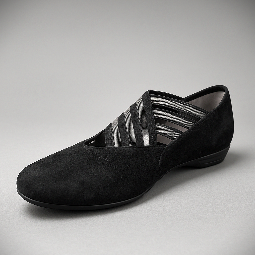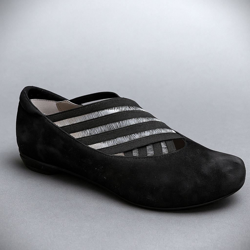 The Bella Comforto 20.03.10 Camelia features a soft black suede-like upper that feels cozy and stylish. Its signature elastic crisscross straps, highlighted with silver-gray thread, add a fun flair while keeping your foot snug. The rounded toe brings timeless comfort, and the low wedge heel offers a gentle lift without sacrificing all-day ease. For extra stability, the rubber outsole sports a hexagonal pattern that grips every step.