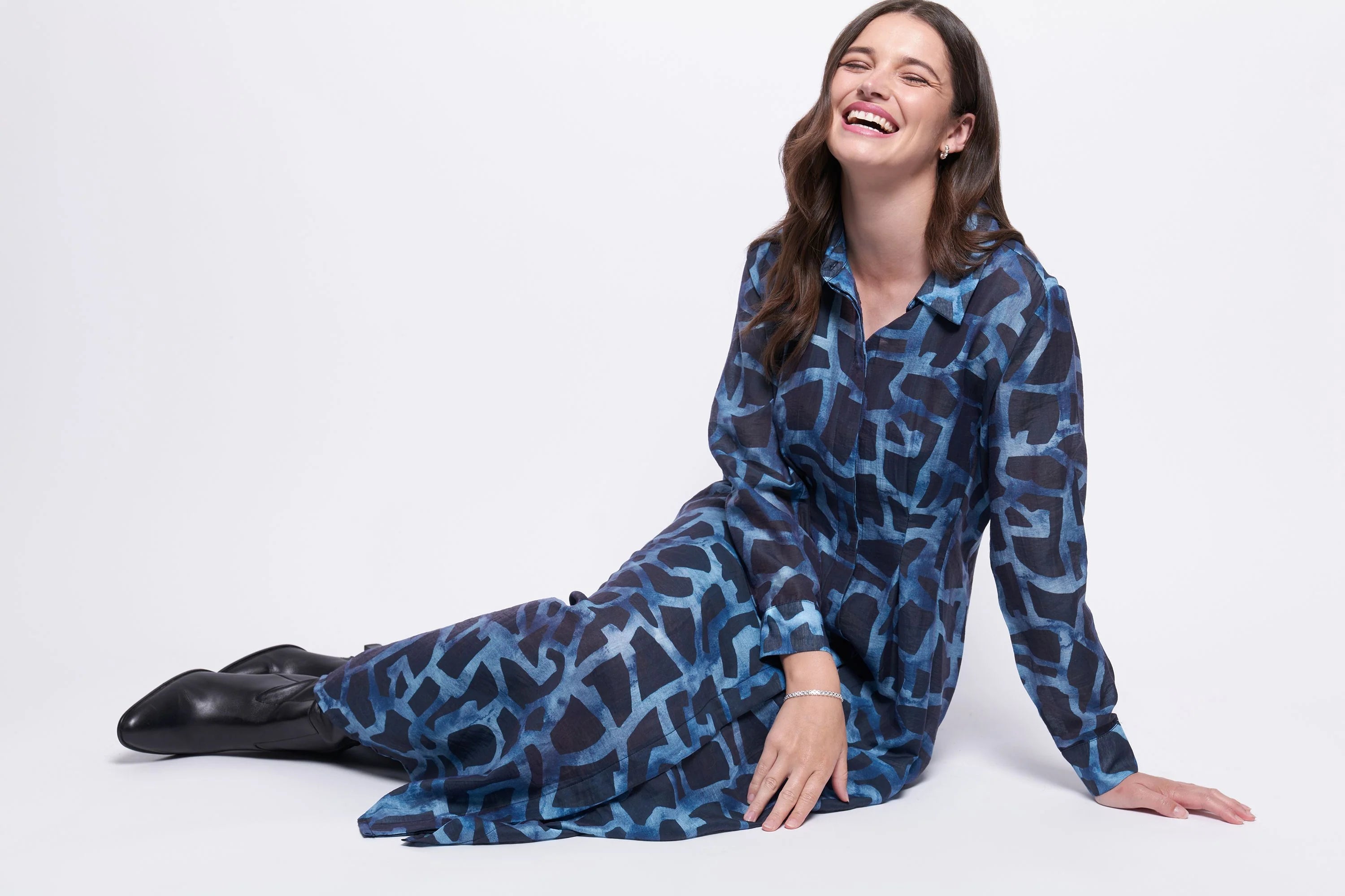 Step out in style with the Foil Master Plan midi shirt dress, featuring a playful navy and blue print that’s sure to turn heads. Its sleek collar and button-down front create a polished look, while the relaxed fit and subtle back darts gently cinch the waist for a flattering silhouette. Full-length sleeves with button cuffs add a touch of charm as they dance at your wrists. The flowing A-line skirt falls to midi length, combining elegance with effortless comfort for any occasion. Each dress is uniquely printed, making your statement piece truly one of a kind.