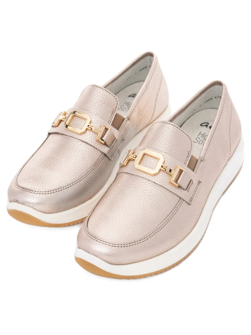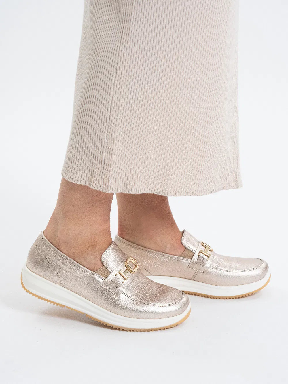 These feminine loafers combine elegant design with excellent comfort and will quickly become a favorite for style-conscious women. The elegant jewelry embellishment emphasizes the feminine look. Thanks to the High Soft technology, the slip-on shoe offers a perfect fit: a combination of super-soft leather and a highly flexible outsole ensures an incomparably comfortable feel. The cozy terry cloth lining and the removable footbed, which is also covered with terry cloth, turn every step into a feel-good experience. The high-quality leather and non-slip sole ensure durability and safety. The look is rounded off by a sporty wedge sole, which is not only fashionable but also increases comfort. These very lightweight loafers are perfect for everyday wear, whether with elegant outfits or relaxed leisure looks. These shoes combine style and function in a harmonious balance.