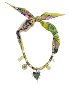 Adjustable satin scarf necklace with interchangeable 18k gold plated charms.