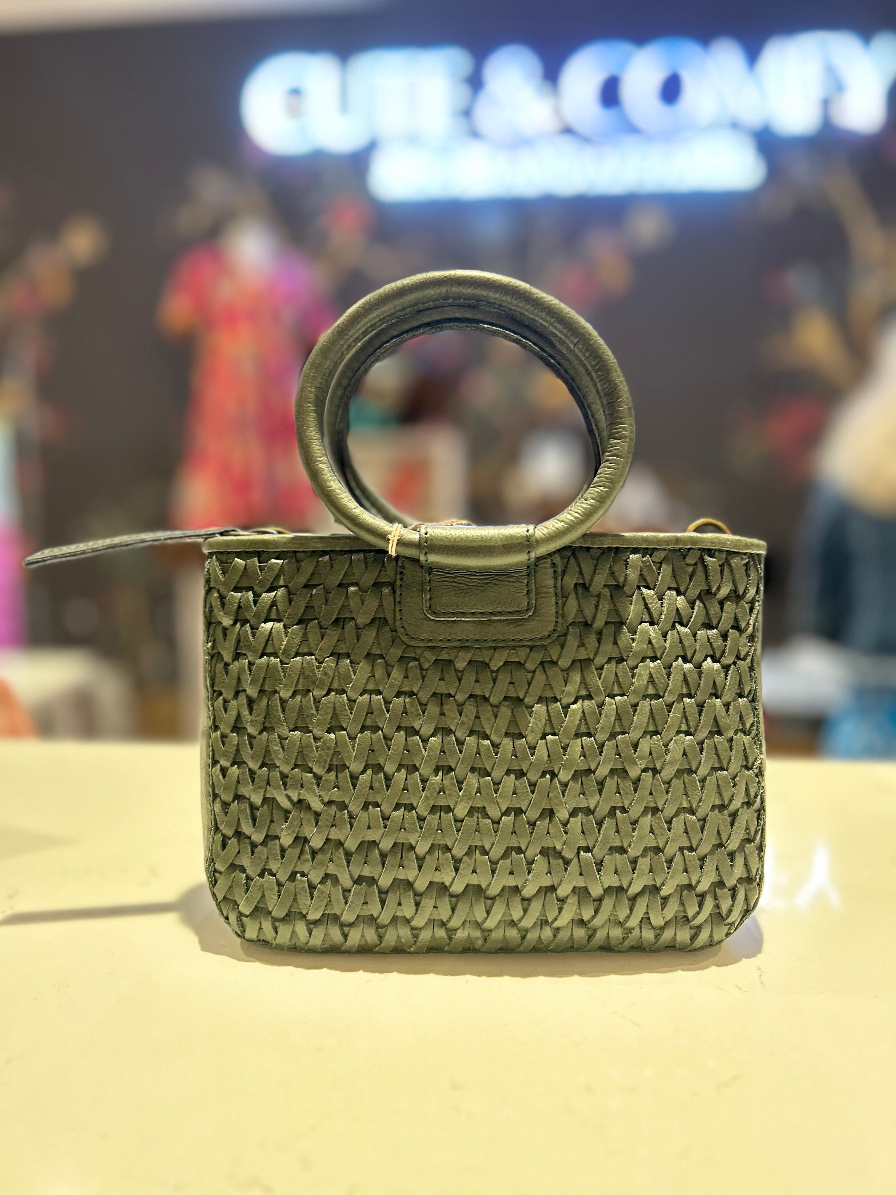 This distinctive crossbody features woven panels on one side for an eye-catching texture and comes with an adjustable and removable crossbody strap for added versatility. With a convenient zip-top closure, AGATHA seamlessly combines style and practicality in a compact package, making it the perfect accessory for those who appreciate both fashion and functionality.