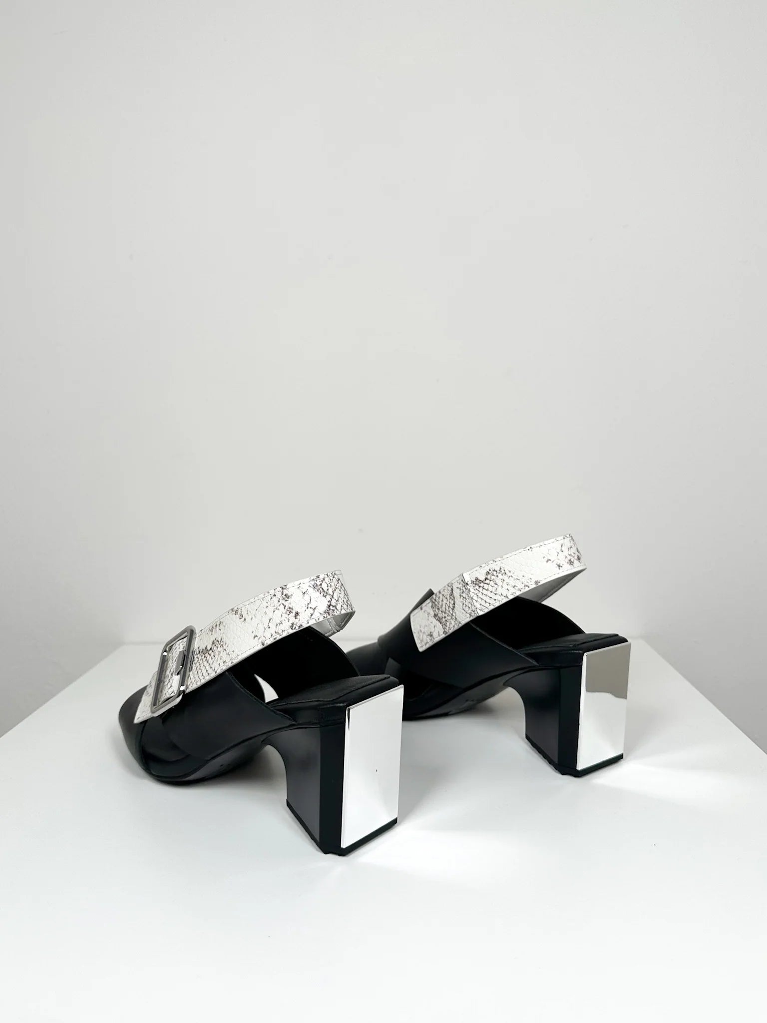 Step into these quirky and fun 4CCCCEES Mirror Verra Slingback shoes! With a block heel, open-toed design, and contrasting straps, these shoes will add a touch of playfulness to any outfit. And don't forget the mirrored panel on the heel, making for a unique and eye-catching look. (Only available in English. Under 50 words. No quotes or exclamation points.)