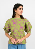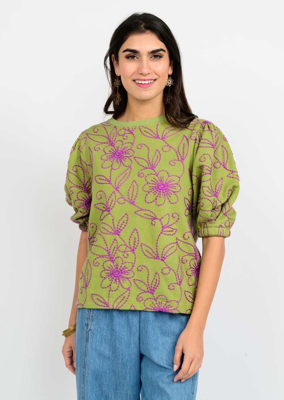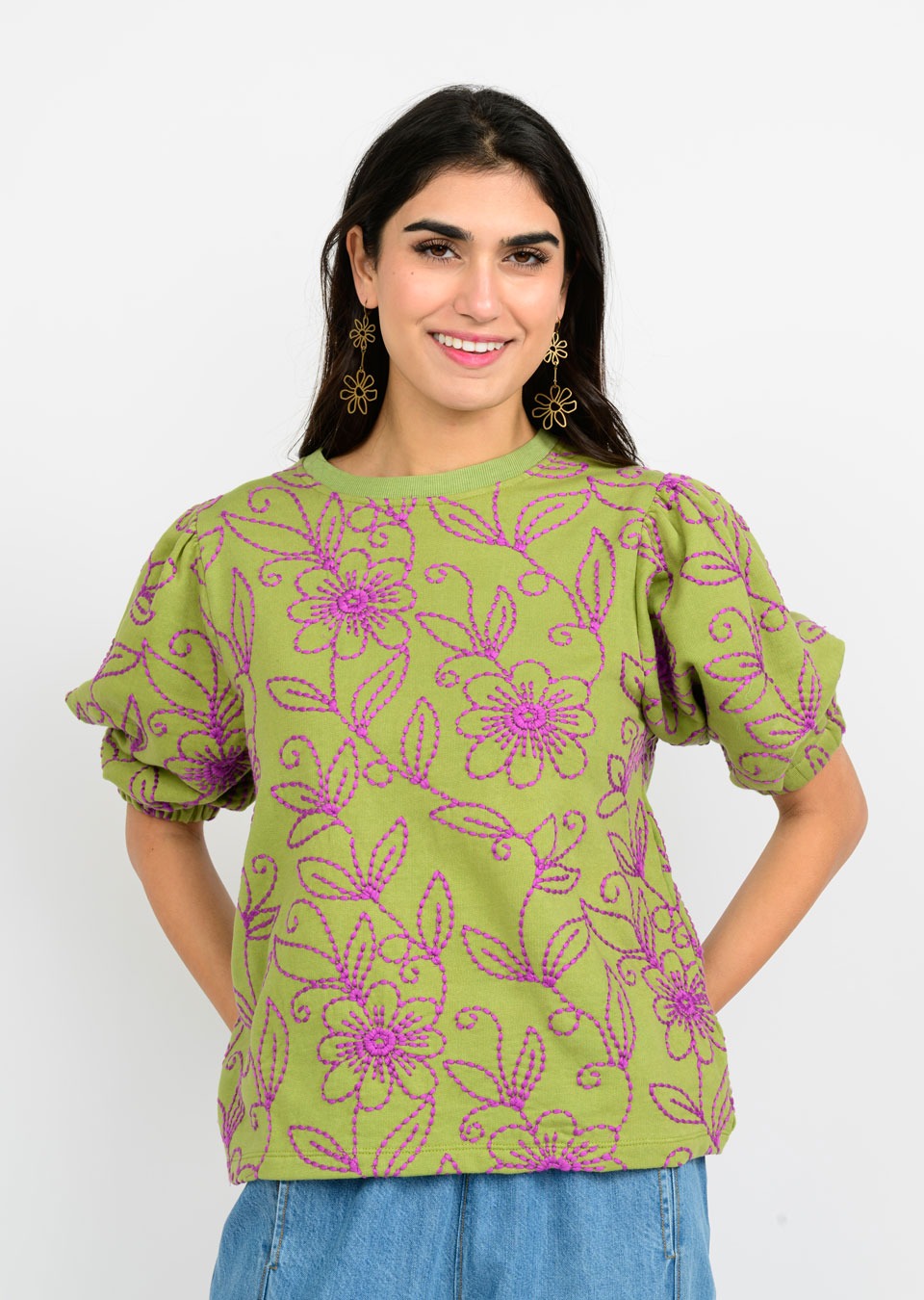Add a splash of fun to your wardrobe with this green knit top, featuring a charming purple floral embroidered pattern. With elbow-length sleeves, it’s perfect for those in-between seasons or layering on the go. Lightweight and comfy, this playful piece makes travel a breeze while keeping your style effortlessly fresh.
