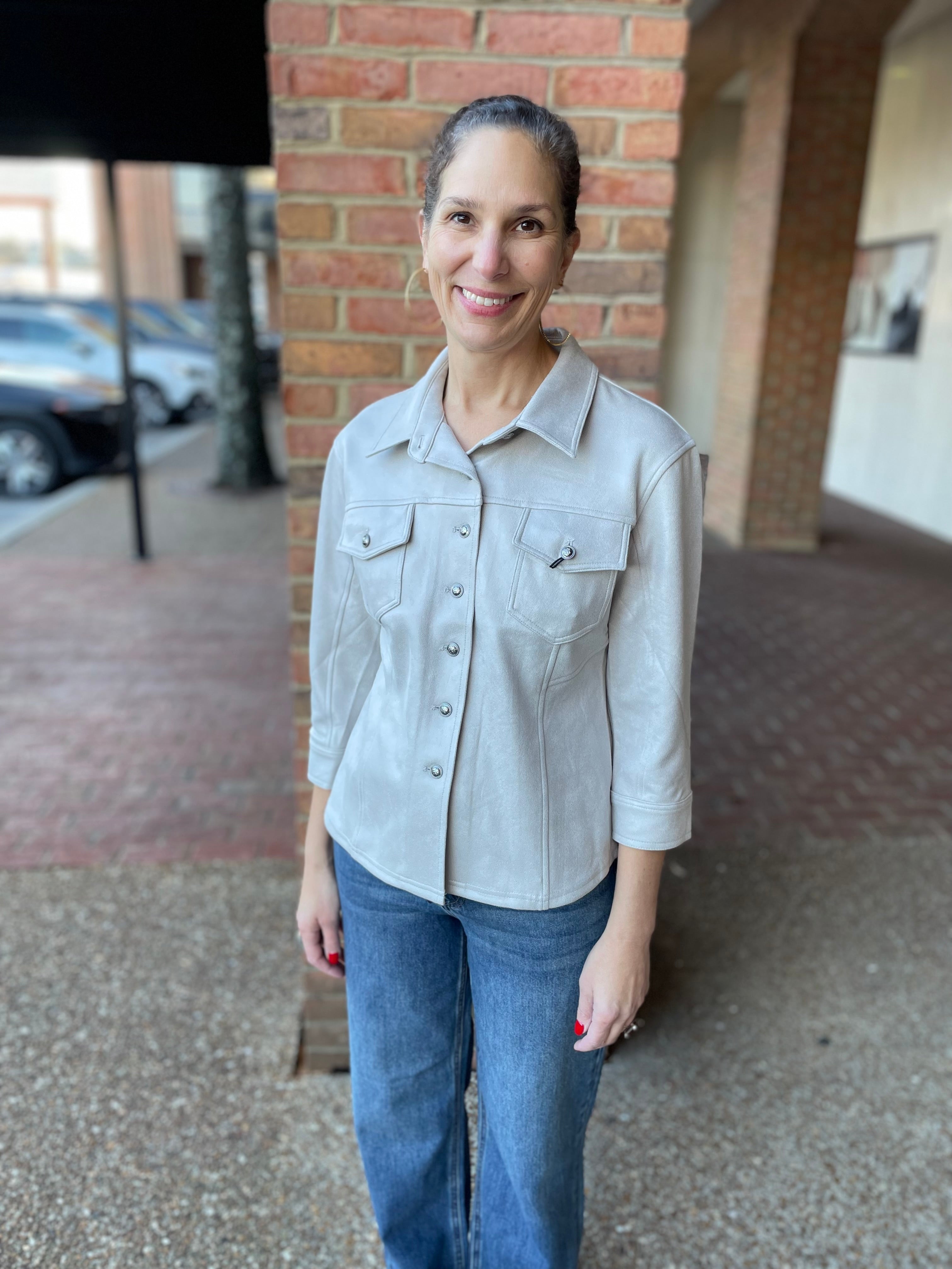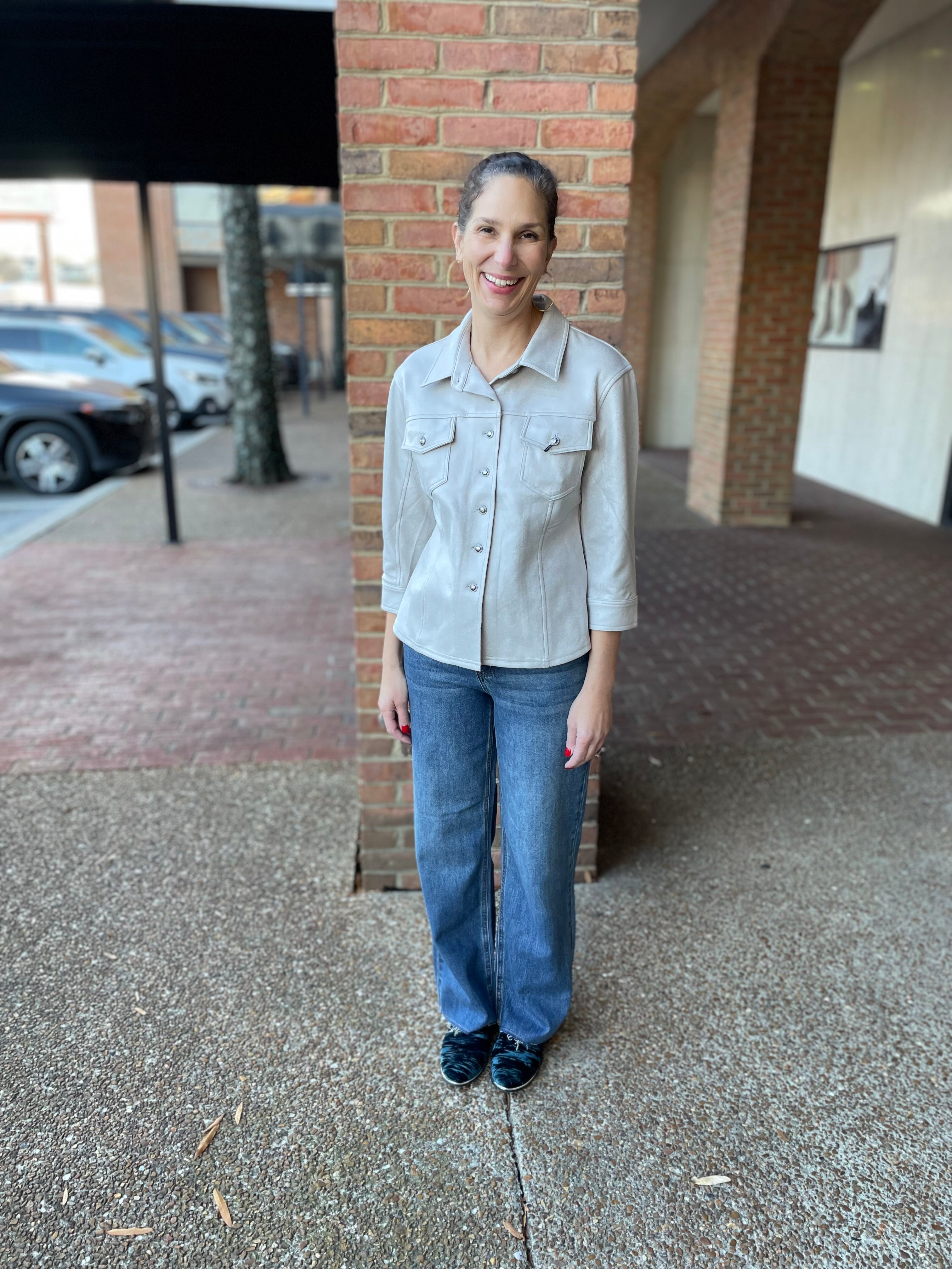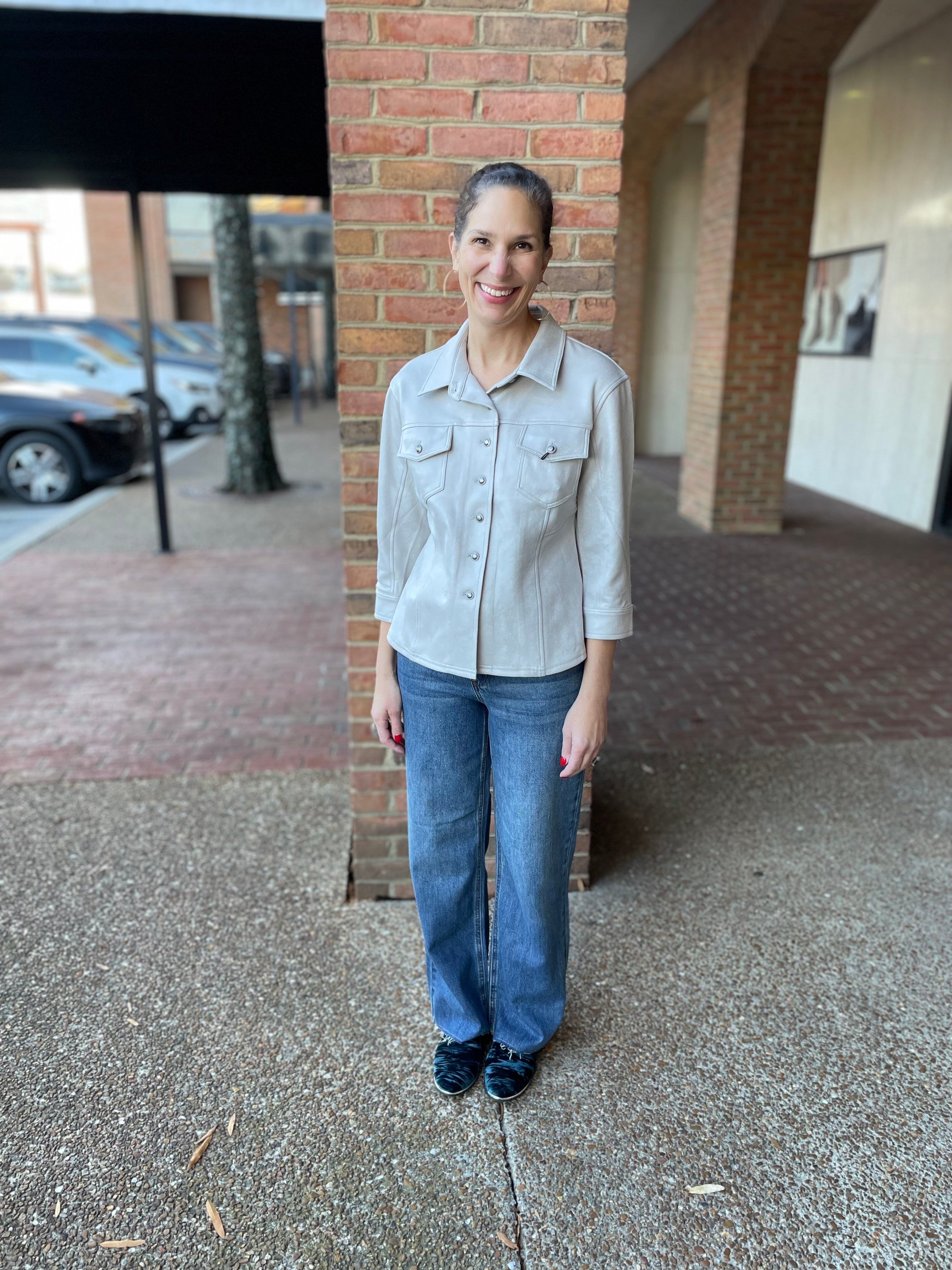 Elevate your fall wardrobe with this chic vegan leather shirt jacket in luxe champagne! Featuring statement crest buttons and a polished silhouette, it's the perfect layer for crisp autumn days. Pair it with your favorite tee or dress it up for evening plans. Cruelty-free style meets timeless sophistication—because looking good shouldn't come at a cost. Your new go-to jacket awaits!
