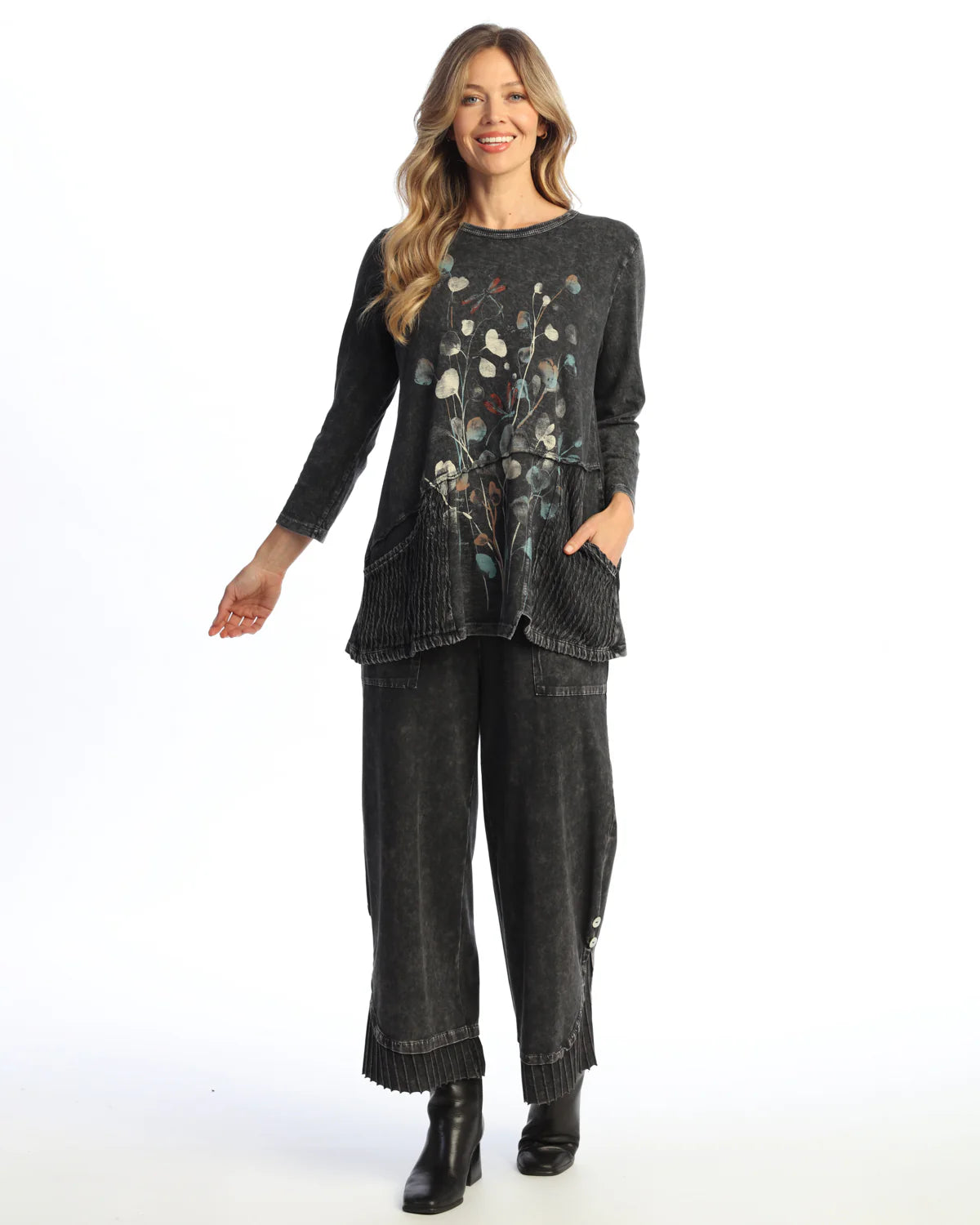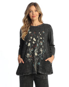 The Jess & Jane M101-2161 Marisol Cotton Slub Tunic blends comfort and quirky style perfectly. Crafted from mineral-washed 100% cotton, it feels soft and lived-in from day one. Playful wavy jersey patch pockets add a fun twist, making this tunic your go-to for easy, breezy days with a splash of personality.