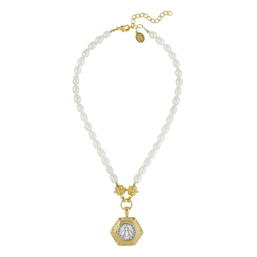 24Kt Gold and Sterling Silver Plated Bee Lira on Genuine Freshwater Pearl Necklace