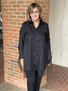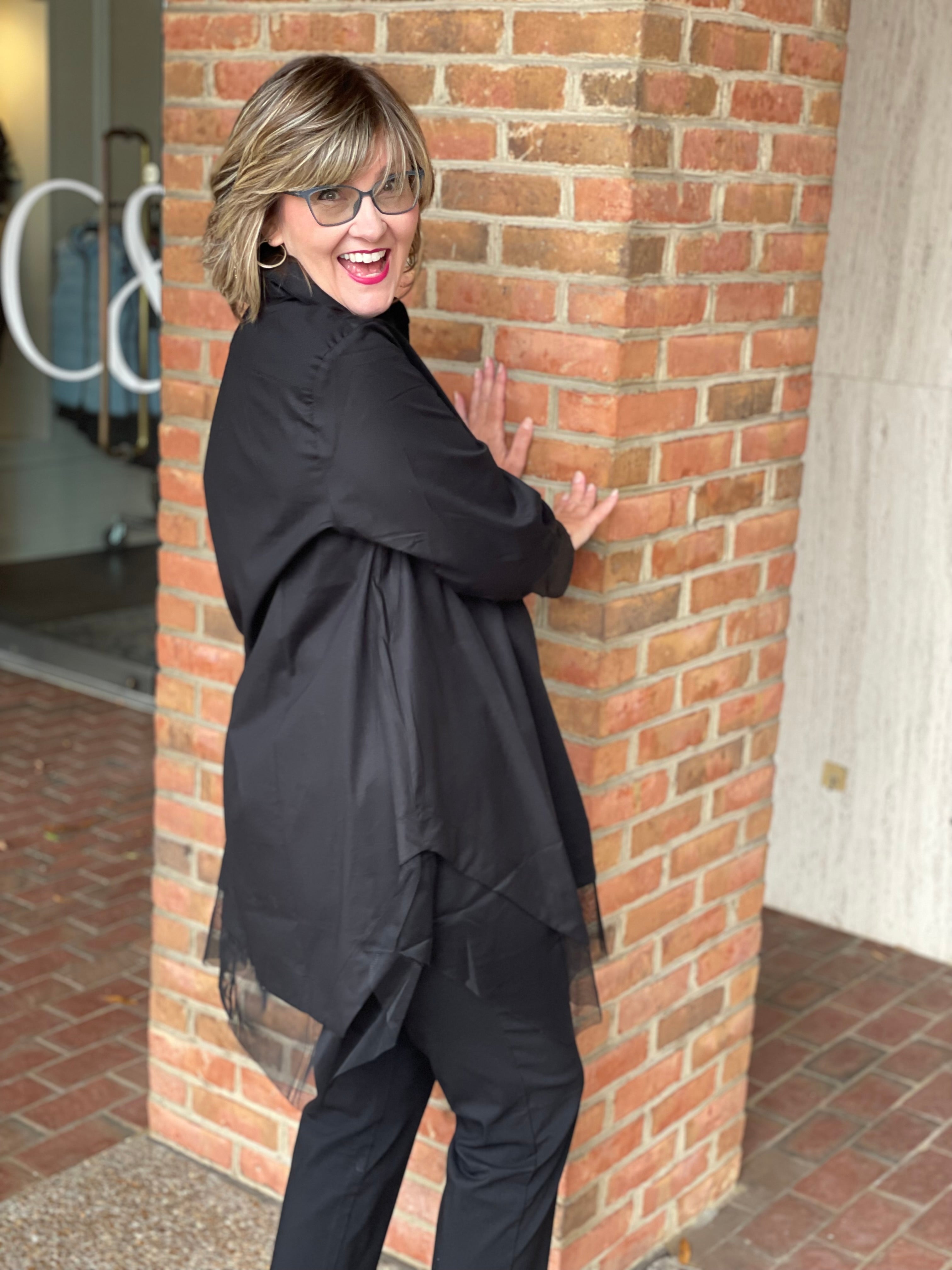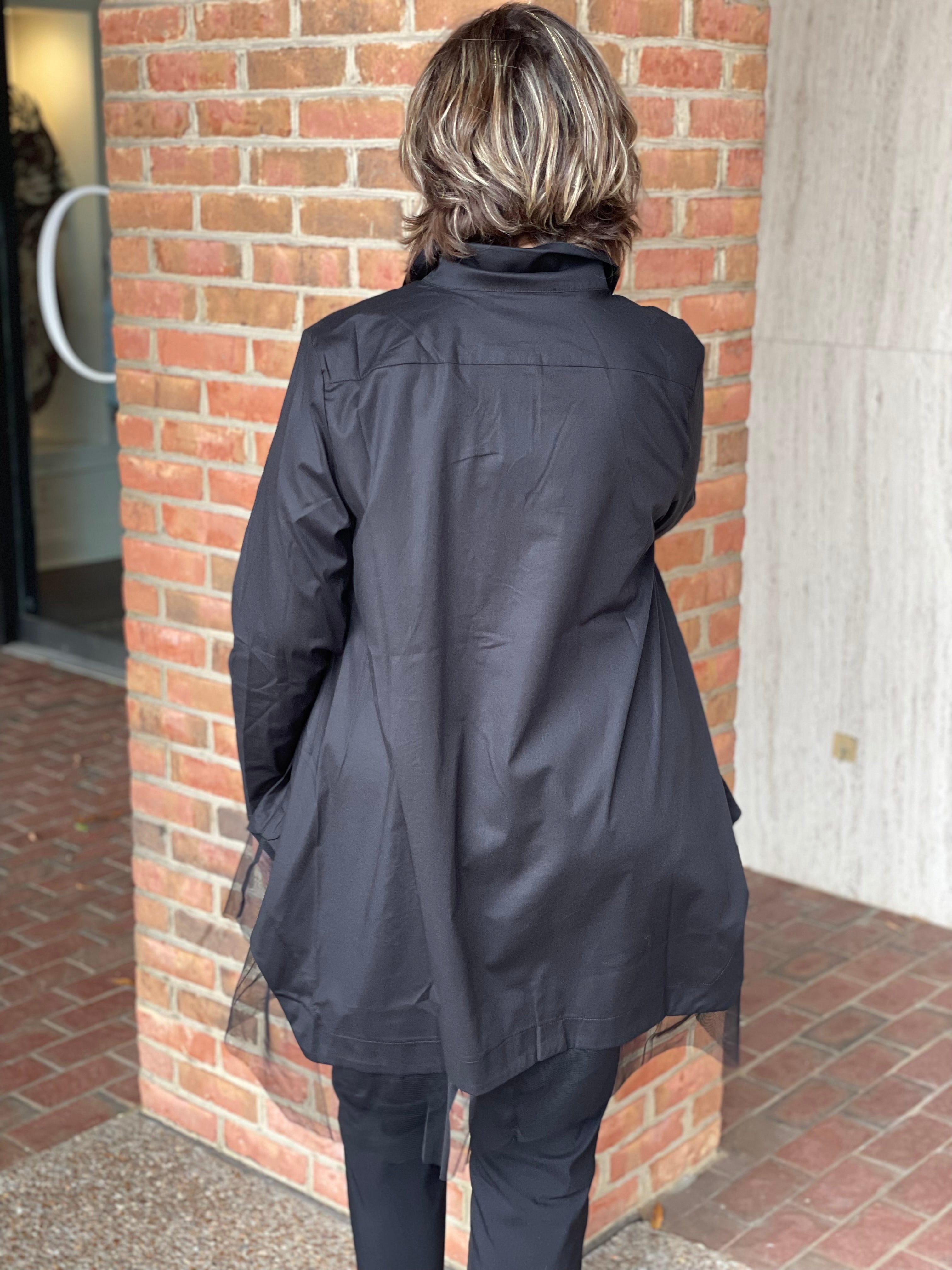 CUTE cotton poplin button down tunic with mesh trim detail.