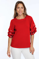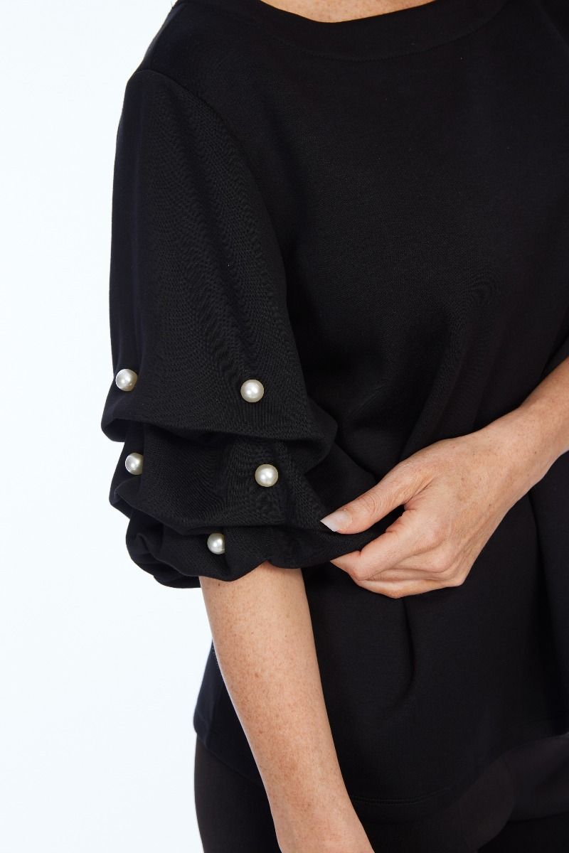 Our Zila has become one of our most-popular scuba knit top due to it's gentle fabric. The scoop neckline adds a touch of charm, while the puff sleeves embellished with pearls make it a true luxury knit top. Elevate your everyday style effortlessly.