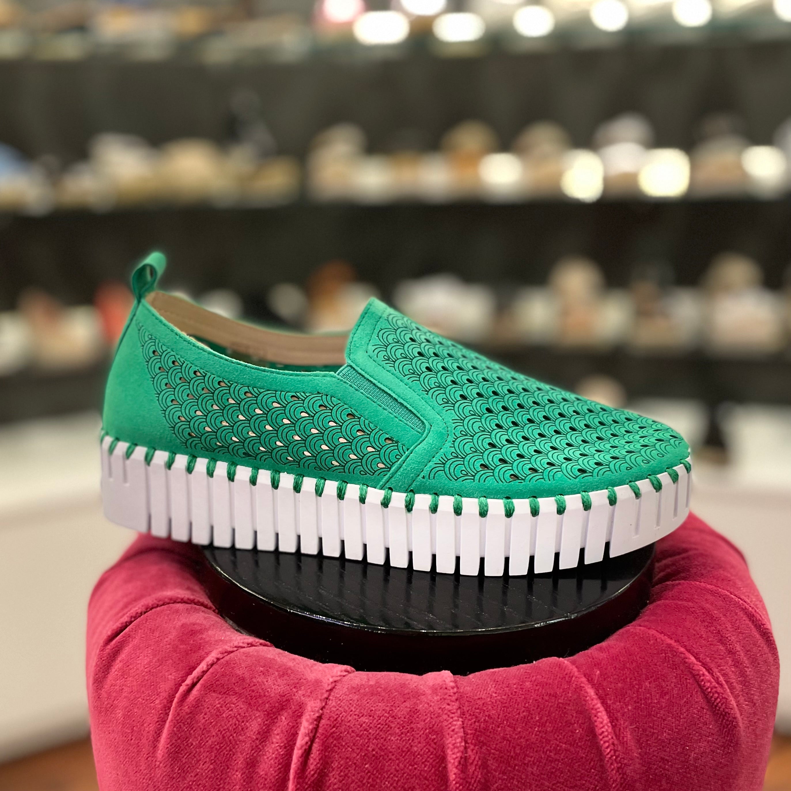 Platform Tulip shoe. The upper is made of recycled microfiber with a decorative laser cut pattern. It is attached to the outsole with matching recycled thread, using no glue. Inside the shoe is a soft and comfortable insole lined with pigskin. The flexible plateau outsole is made of 75% natural rubber and 25% recycled rubber. Insole: 60% EVA and 40% Pigskin. Recycled microfiber: 60% Nylon, 40% PU.