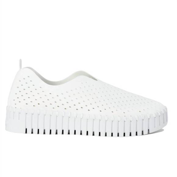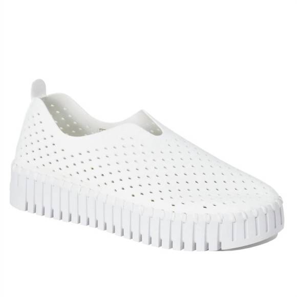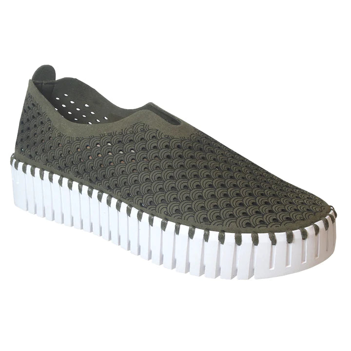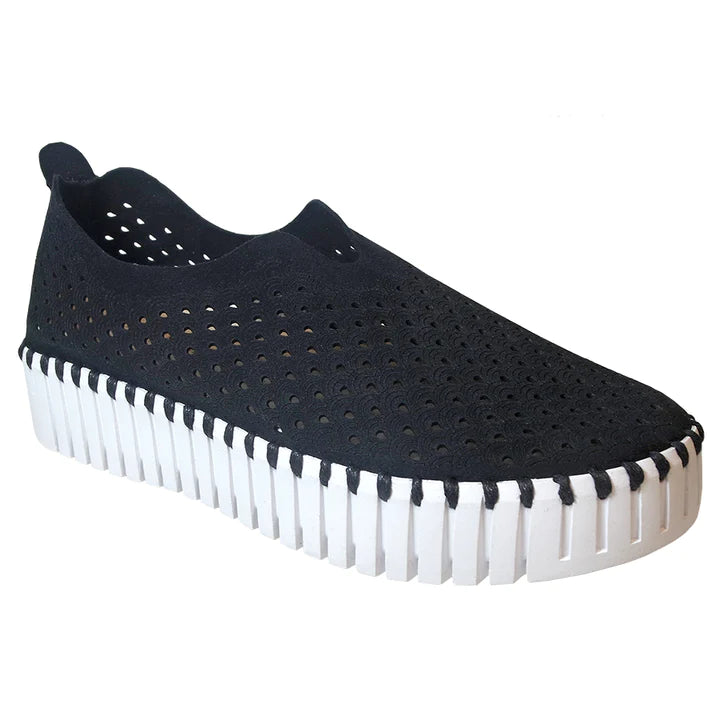 Platform Tulip shoe. The upper is made of recycled microfiber with a decorative laser cut pattern. It is attached to the outsole with matching recycled thread, using no glue. Inside the shoe is a soft and comfortable insole lined with pigskin. The flexible plateau outsole is made of 75% natural rubber and 25% recycled rubber. Insole: 60% EVA and 40% Pigskin. Recycled microfiber: 60% Nylon, 40% PU.
