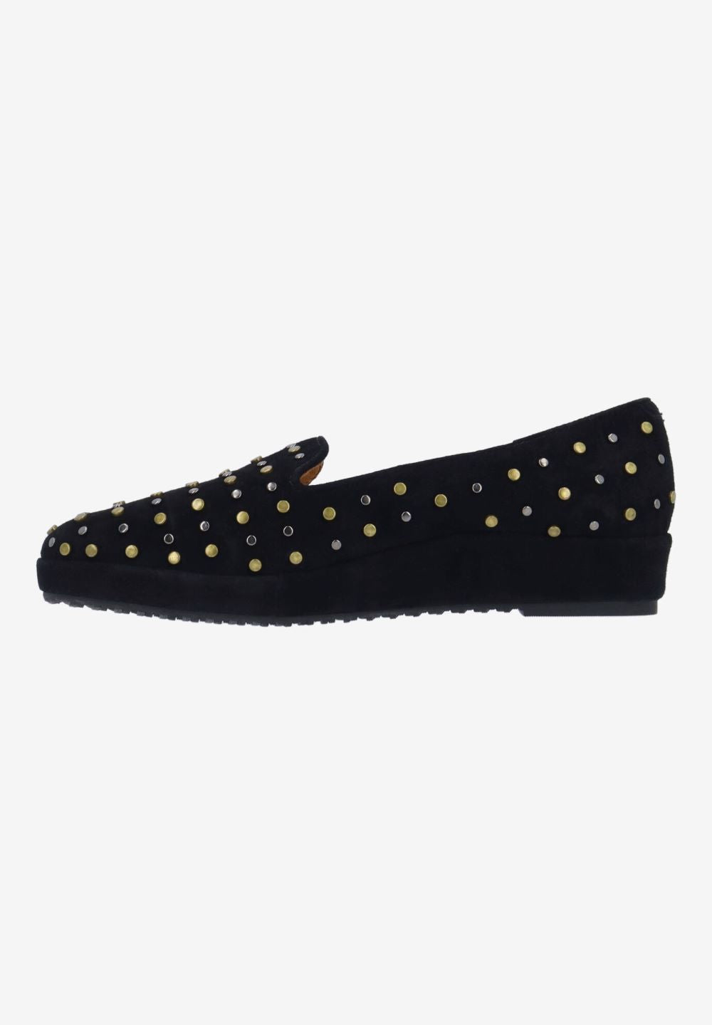 This leather round toe loafer has a memory foam insole, leather lining and synthetic outsole. This slip on shoe is on a 1.25 inch heel.