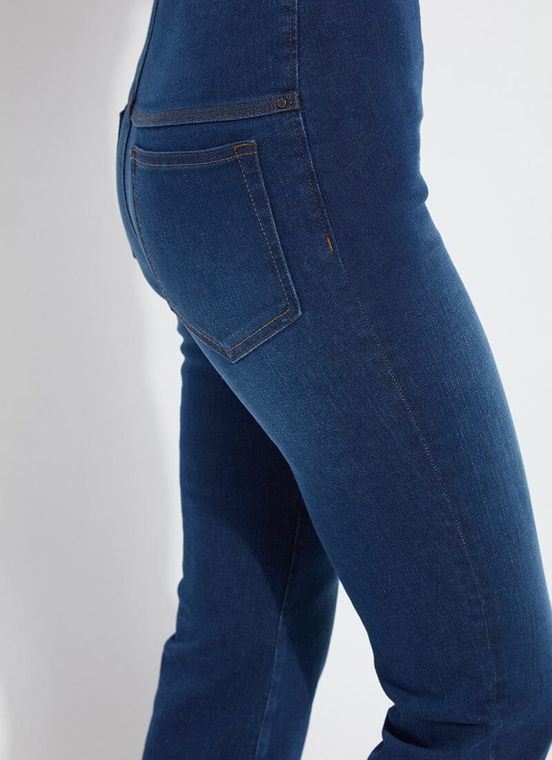 These ankle-length bootcut jeans showcase an authentic denim look with two-toned tobacco topstitching, back pockets with metal studs, and a released natural fringe hem. Made from “Holding Power” Denim – a woven denim that adapts to all shapes – the Ankle Baby Boot Premium Denim jean keeps its shape and has an ultra-soft feel. These bootcut jeans feature a concealed patented waistband, two-way stretch and pull-on styling. Style with a tucked Miley Stretch Chambray Shirt and sneakers for an on-trend denim-on-denim look. Size up if between sizes.