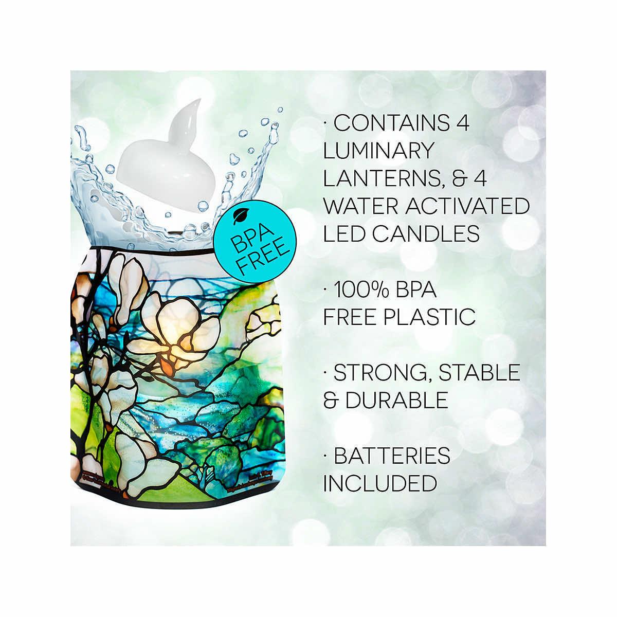 Includes: 4 Luminaries and 4 water-activated, floating LED candles. Batteries included.