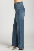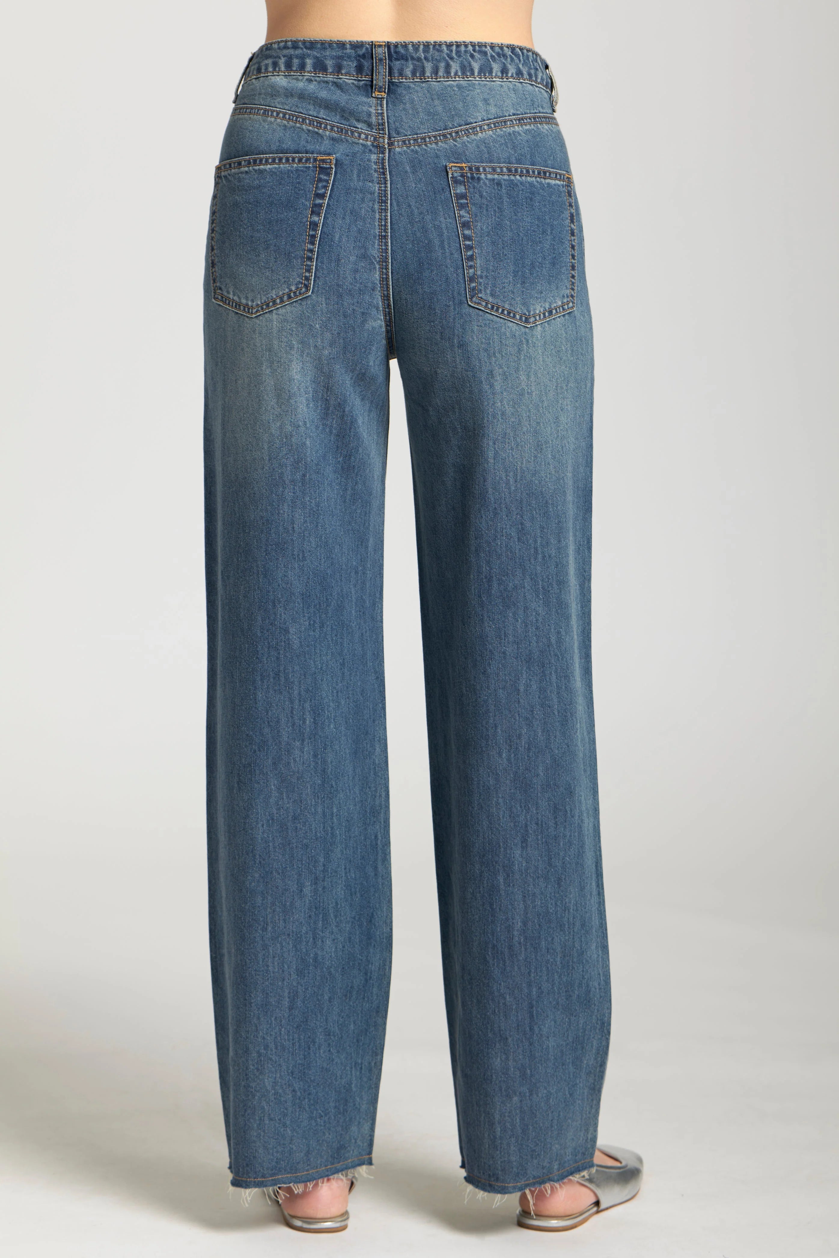 These high-waisted, wide-leg jeans feature a light indigo wash with a relaxed fit for effortless style. Designed with a classic five-pocket construction and subtle seam details, they offer a vintage-inspired yet modern look. Perfect for casual or dressed-up styling!