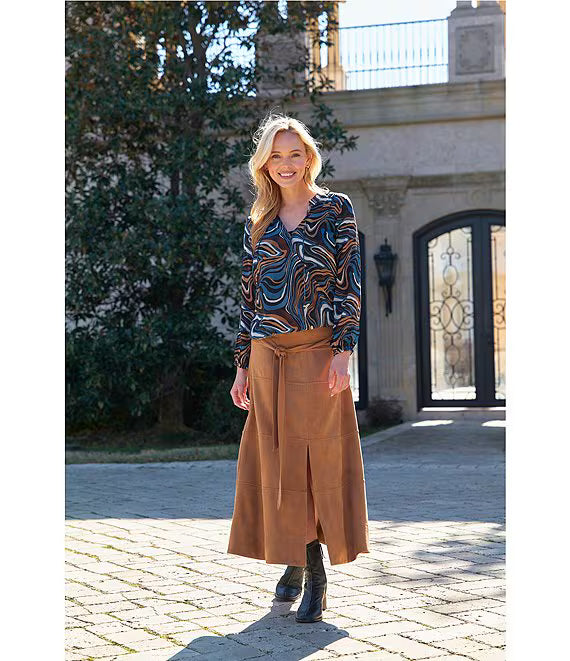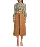 Slip into effortless elegance with this vegan suede midi skirt that's as kind to animals as it is to your wardrobe. The flattering A-line cut pairs perfectly with the self-tie belt for customizable styling, while the side zipper keeps things sleek and streamlined. At 27 inches, it hits just right for a sophisticated look that works from office to evening. Crafted from a luxe polyester-spandex blend with a faux suede knit finish, this beauty is surprisingly low-maintenance—just toss it in cold water and line dry. Comfort meets chic in one irresistible package.