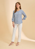 Even if you're in a hurry, you can quickly look put-together. The light and airy feel comes from the breathable cotton, while the wide neckline and soft collar highlight your face nicely. You can button it up for a work-ready look or leave it open over a tank top. The 3/4 sleeves are practical, and the stripes provide a timeless style.