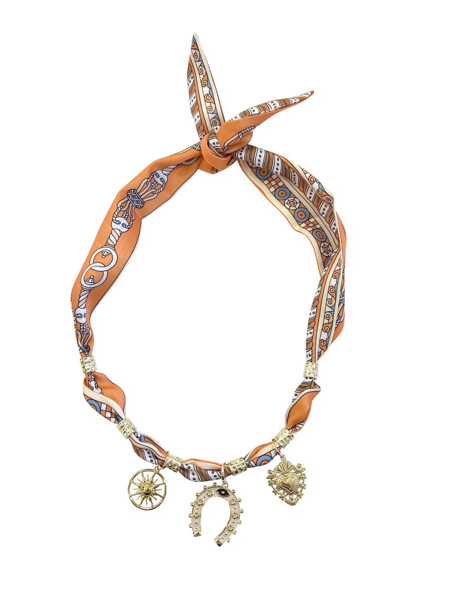 Adjustable satin scarf necklace with interchangeable 18k gold plated charms.