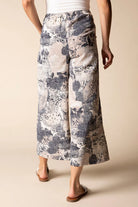 The perfect light weight, airy fabric with a subtle ripple texture, pull on waist with flat front and half elastic back. Built in pockets, button detail hem. Exclusive print.