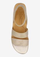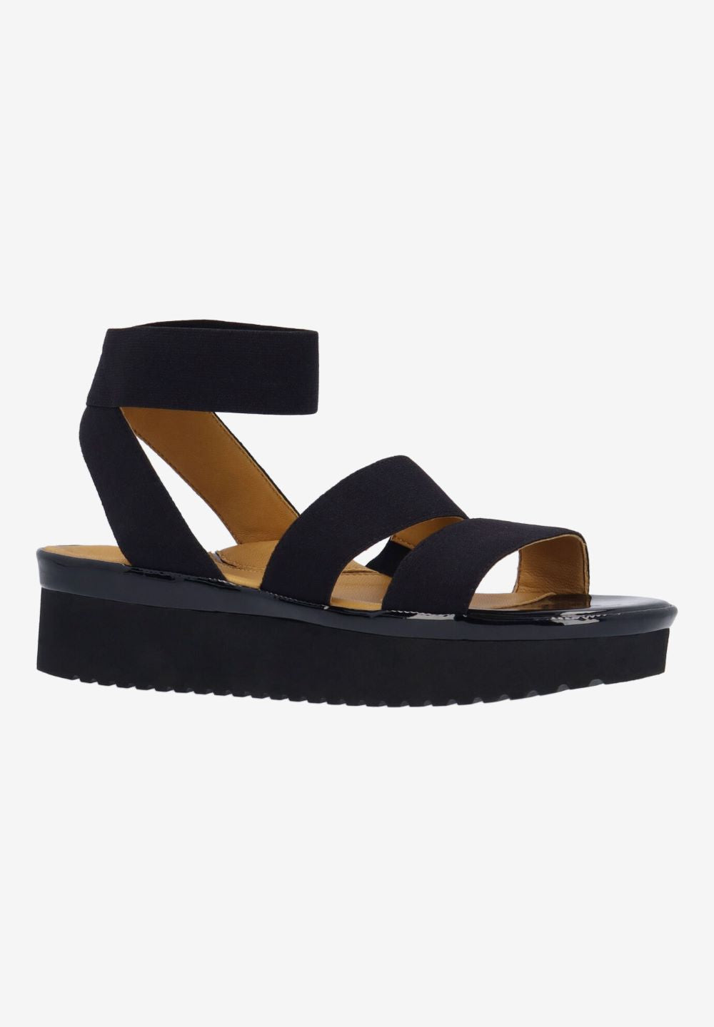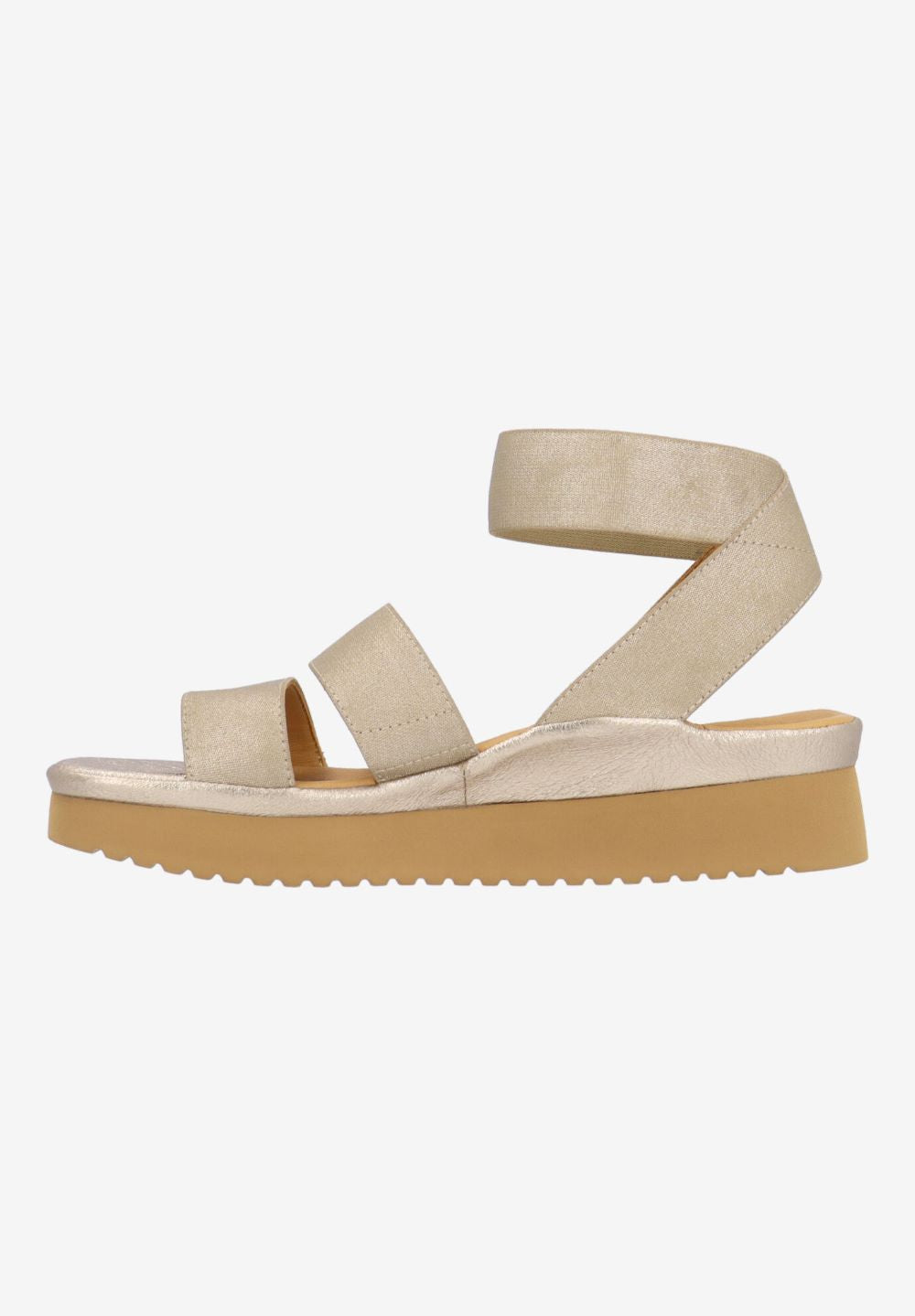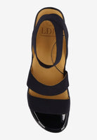 This elastic round toe sandal has a memory foam insole, leather lining and synthetic outsole. This slip on shoe is on a 1.75 inch heel.