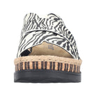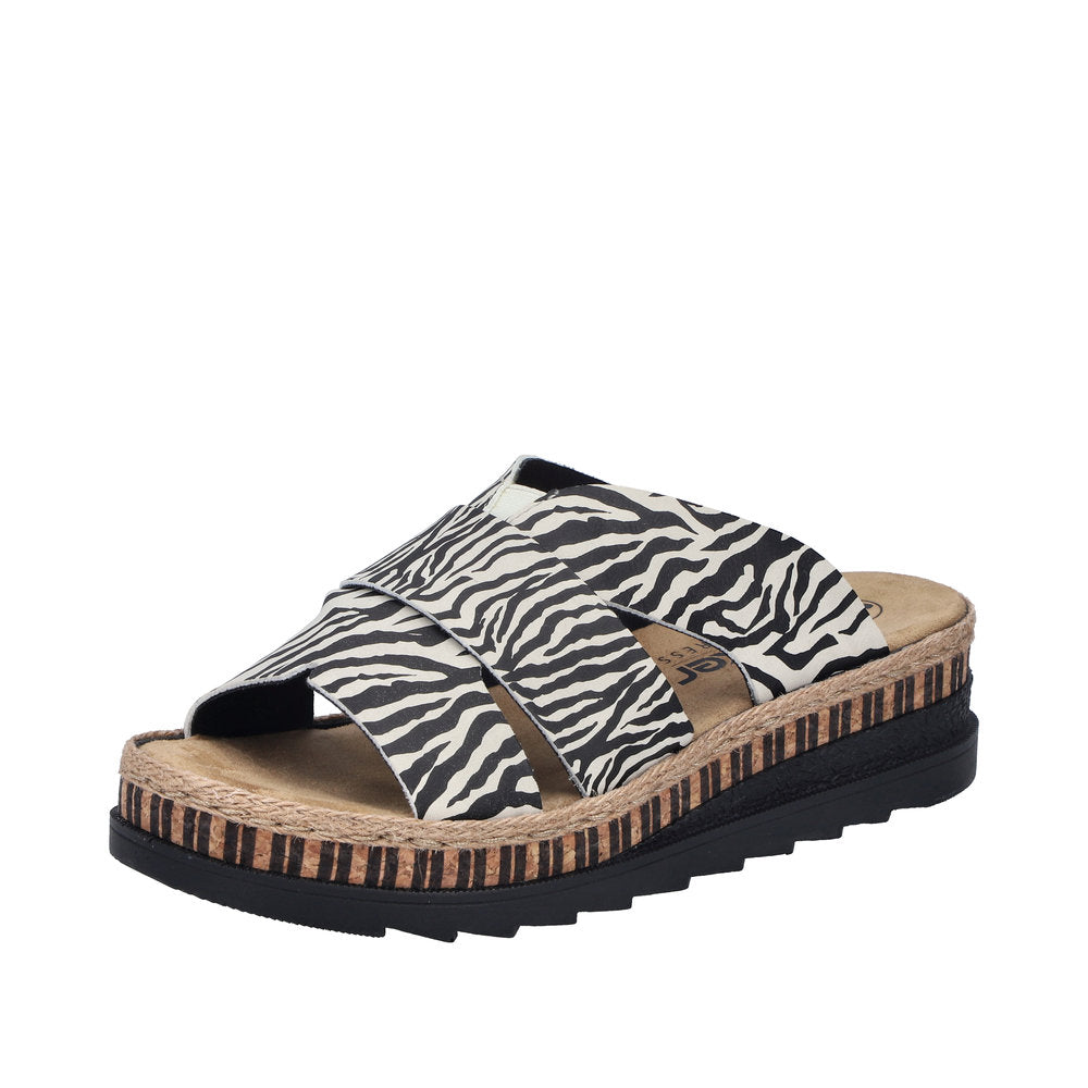 All-time favorite! These black-white Rieker mules are guaranteed to get you in the summer mood. The stitchdown construction makes this shoe a particularly durable and flexible companion. An elastic band is a great simplification especially when putting on and taking off the shoe. The fashionable animal print gives the shoe that certain something. The very light and shock-absorbing sole with wedge heel ensures a cushioned walking experience. In addition, the cover sole is extra soft. Moreover, the narrow fit provides extra support. Attention, potential favorite shoes.