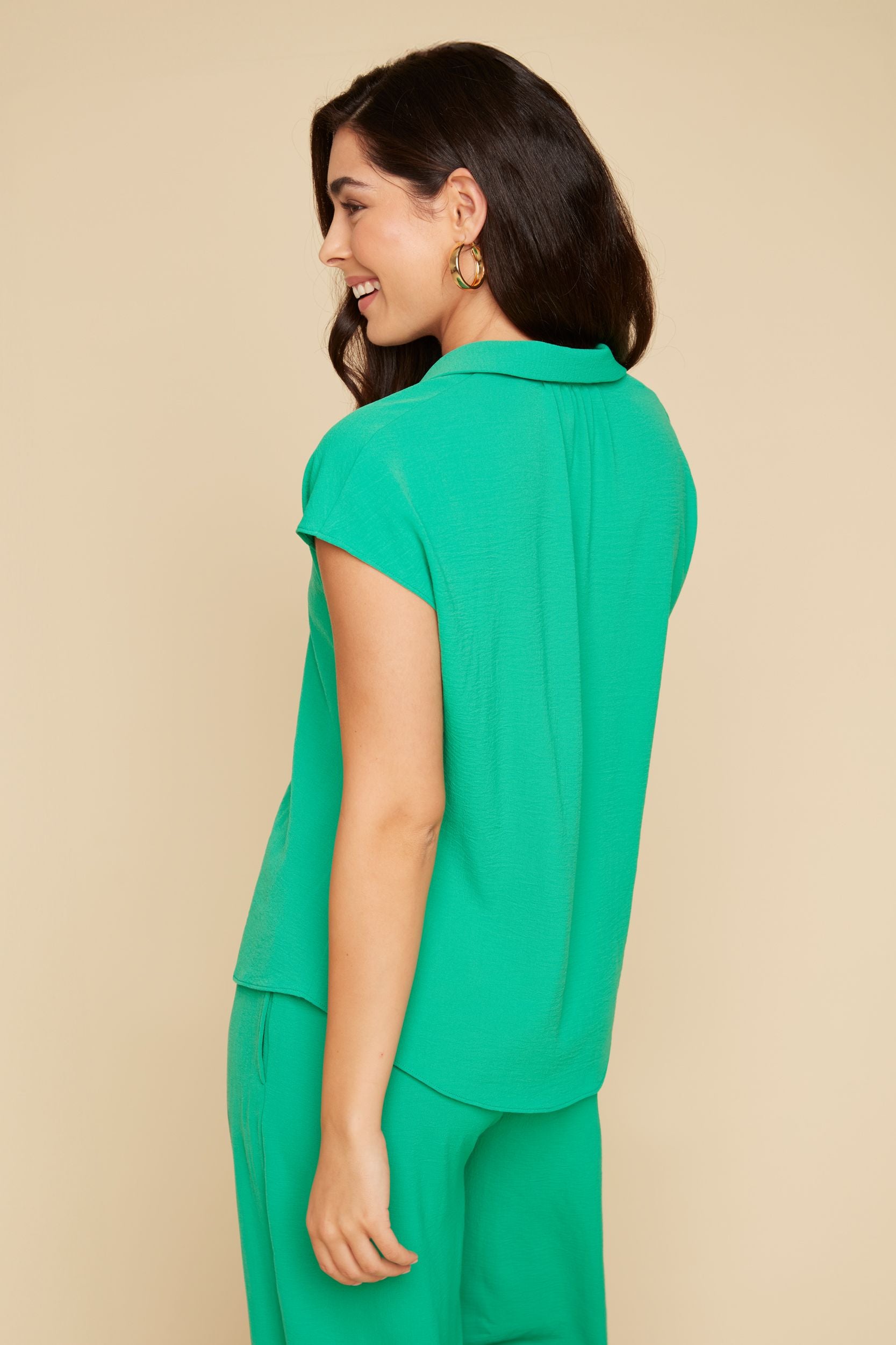 This classic button-front blouse is the perfect addition to your warm-weather wardrobe. Featuring a crisp collar and cap sleeves, it offers a polished yet relaxed look. The lightweight design pairs effortlessly with capris, cropped pants, or shorts, making it ideal for casual outings or a day at the office. Whether tucked in or left out, this versatile blouse is sure to complement your favorite summer styles with ease.