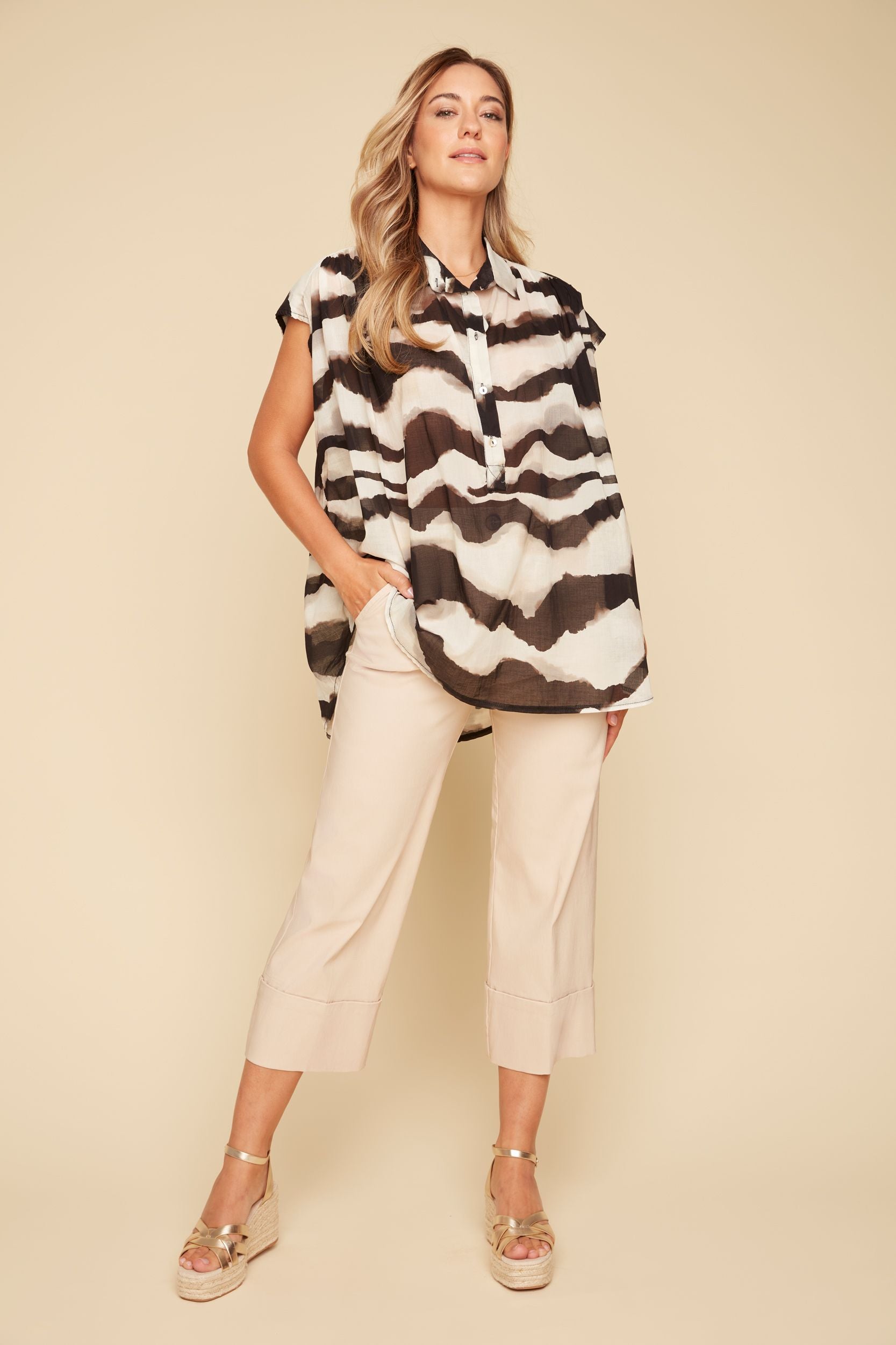 Effortlessly chic, this Renuar blouse features a striking black and cream print that brings a modern edge to a timeless silhouette. Designed with a classic collar and button-up front, it drapes beautifully in a relaxed, loose fit for all-day comfort and style. We recommend sizing down for a more tailored look.