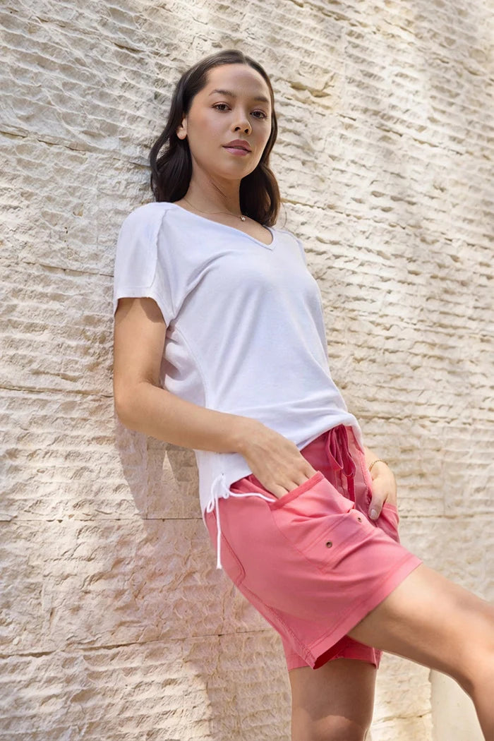 Cinchable side cords grace this v-neck slub jersey top; also featuring a front yoke, dolman sleeves, and raw-edge details throughout.