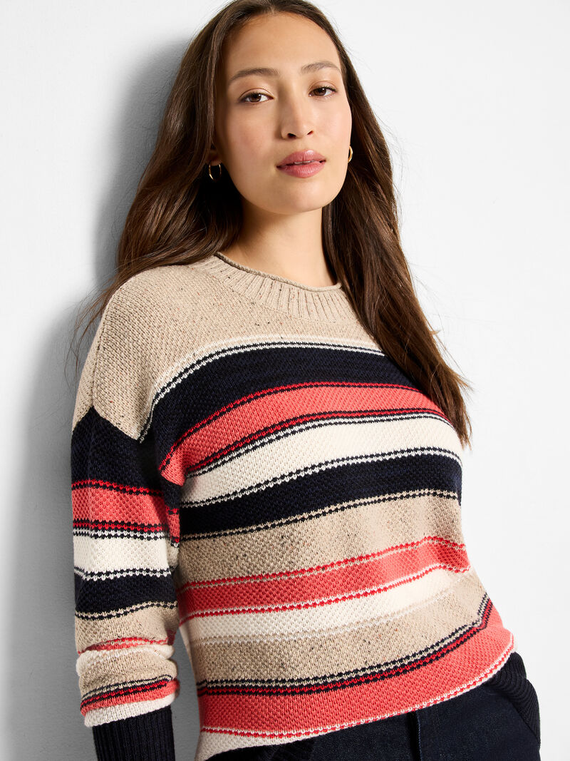 Maybe the most comfortable sweater we've ever made (and that's really saying something).Made from our supersoft waffle stitch construction, she looks as good as she feels thanks to placed stripes, and hits of nep detailing to make this piece really pop. Pullover and easy fitting with a dropped shoulder silhouette for a touch of extra roominess.