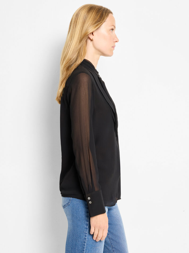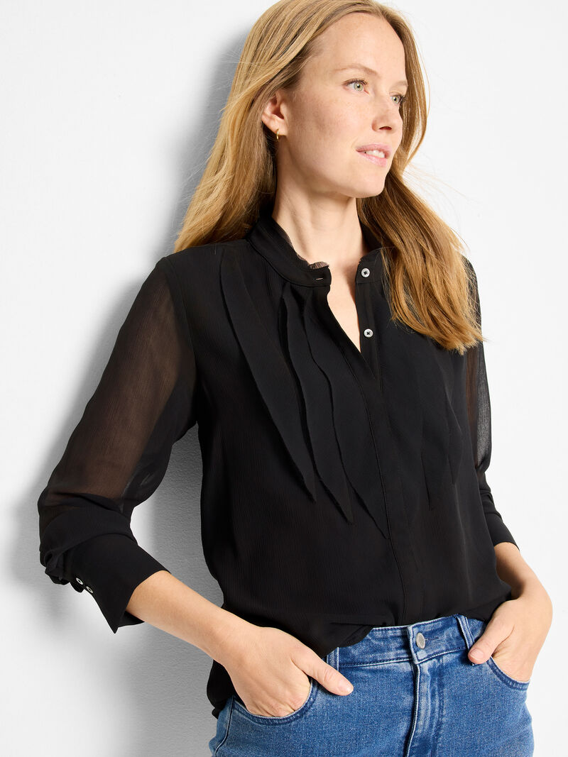 A workday wonder with artful allure. This chiffon top pairs rich texture and dimension with everyday ease. For this white version, we recommend wearing a layer underneath if you don't want to be the victim of a sheer surprise. Delicate folds at the collar add a playful, polished touch -- perfect for elevating your office look. Designed with a double-layered front and back for coverage while offering just a touch of sheer lightness, it delivers effortless sophistication. The back is tailored for shape, ensuring a flattering fit from every angle. Pair it with trousers or a pencil skirt for an instantly refined ensemble.