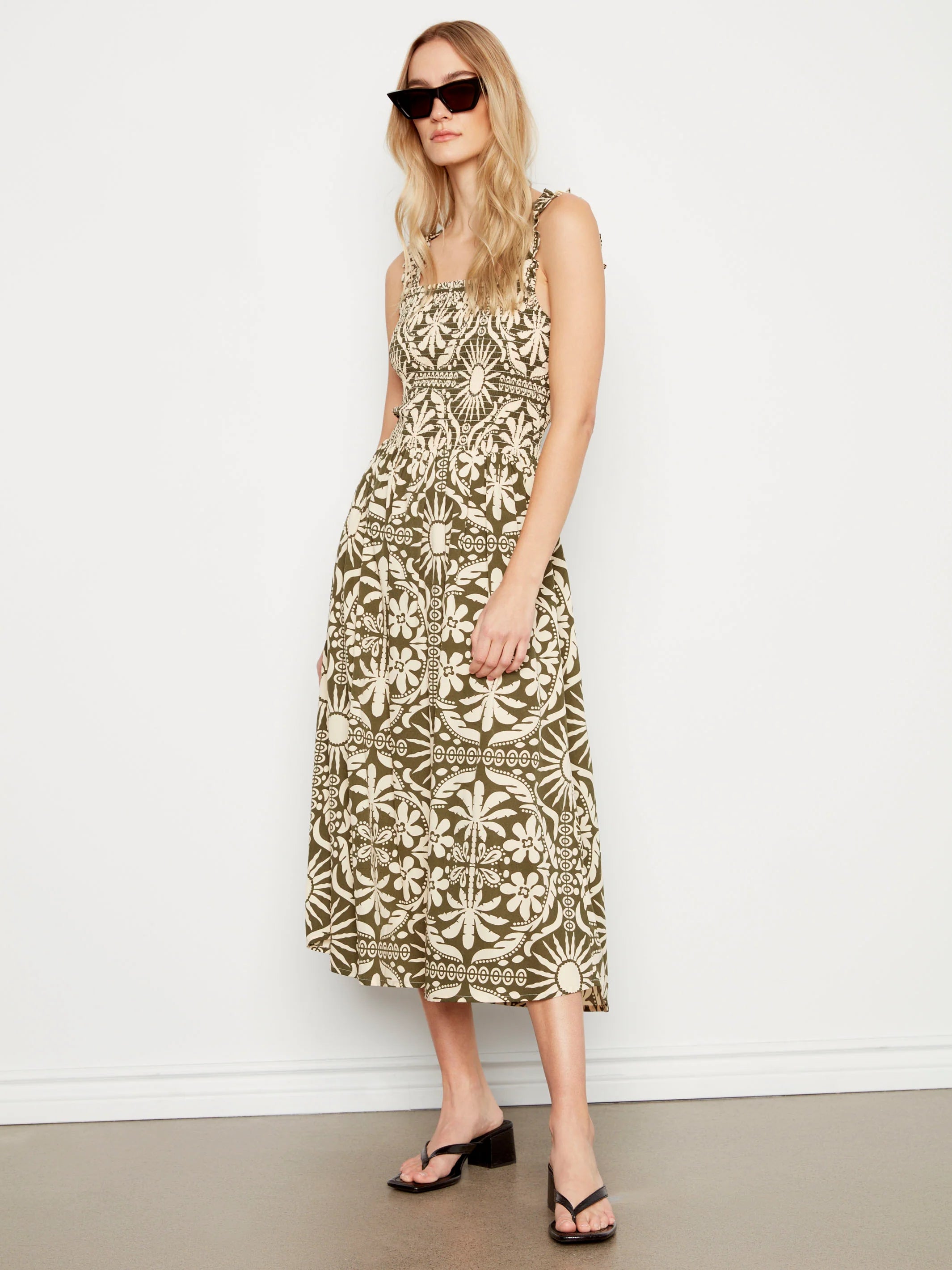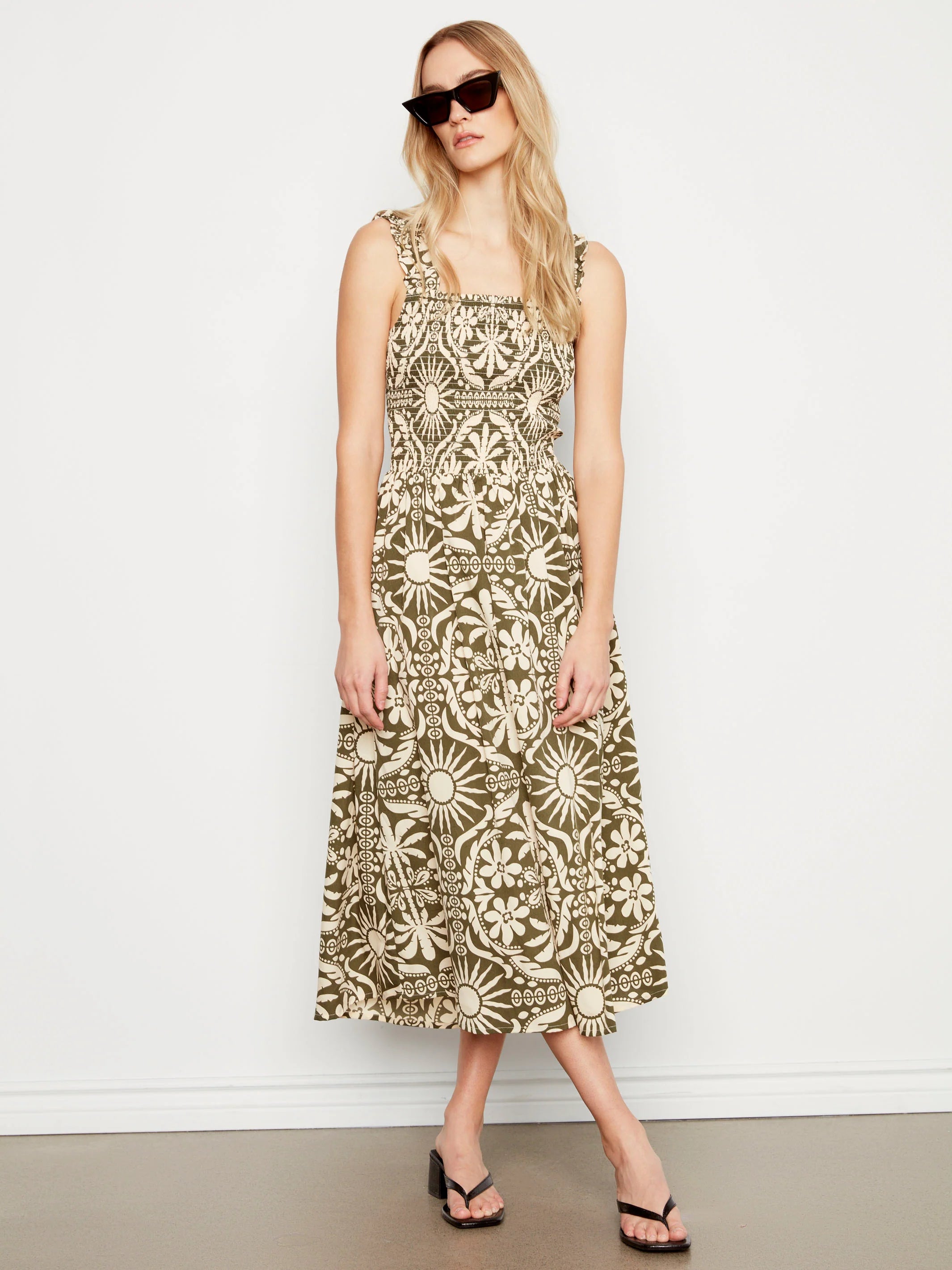 Feel elegant in this printed sleeveless midi dress. The shirring detail on the bodice gives it a charming touch, and the captivating celadon green print brings an artistic feel. Made from light and airy fabric, it drapes beautifully, making it ideal for a day out or a casual evening. Enjoy effortless style with this versatile piece during spring and summer.