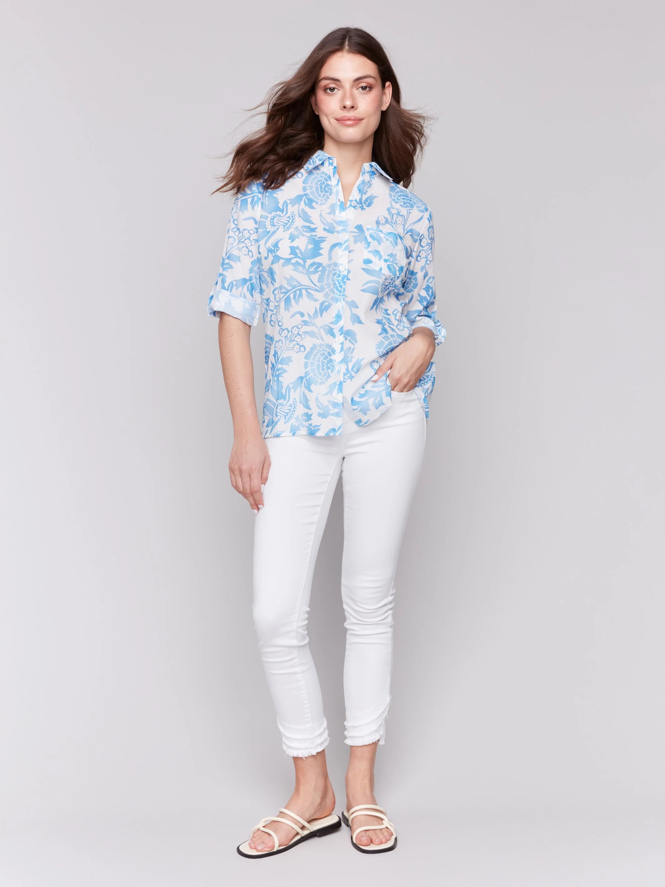 Keep cool and stylish in this printed long sleeve shirt. The gentle blue and white floral patterns bring vibrancy to your outfit, while the chest pocket adds a touch of practicality to your look. It's crafted to catch attention and is sure to become a treasured piece in your spring & summer wardrobe.