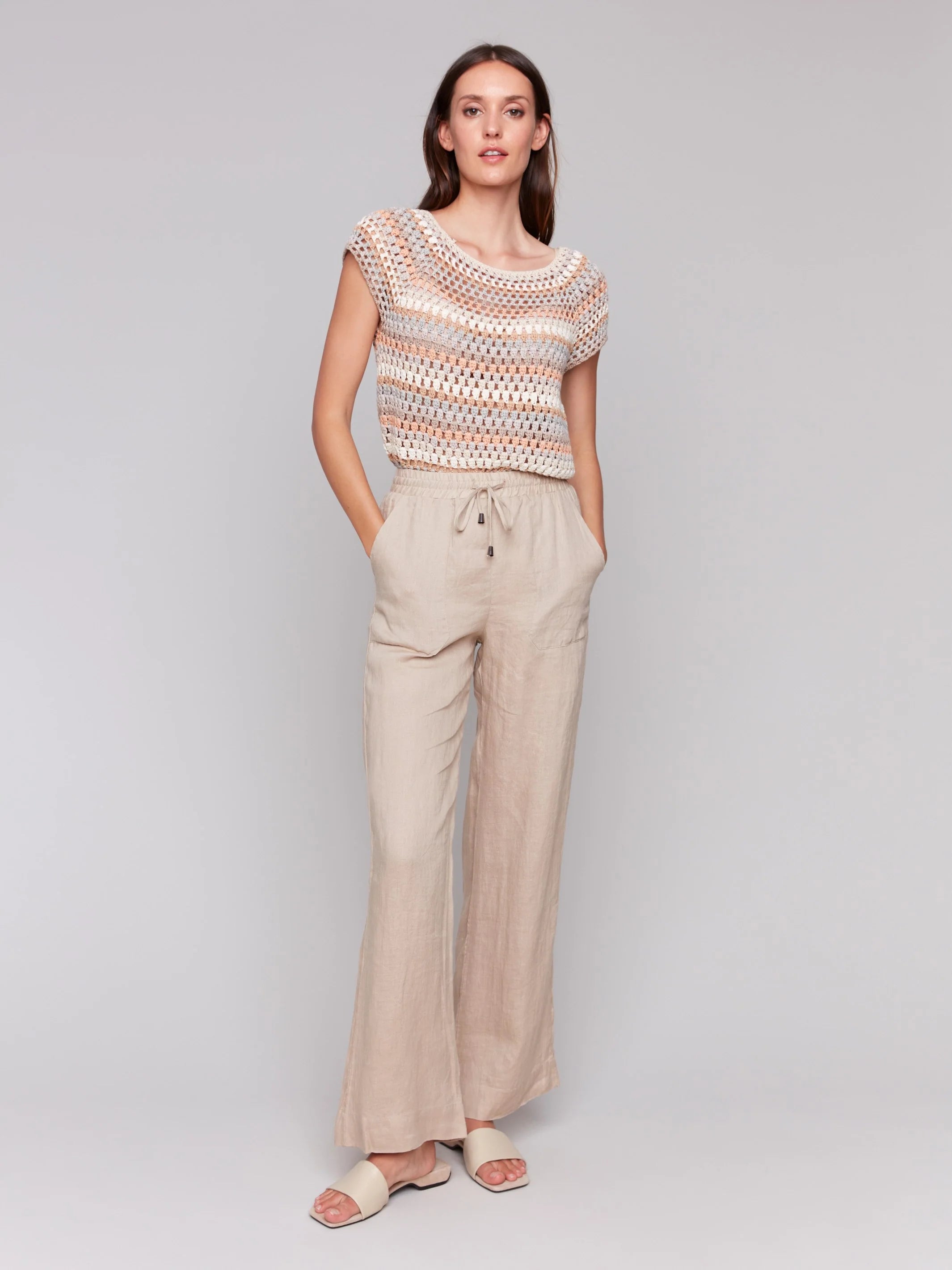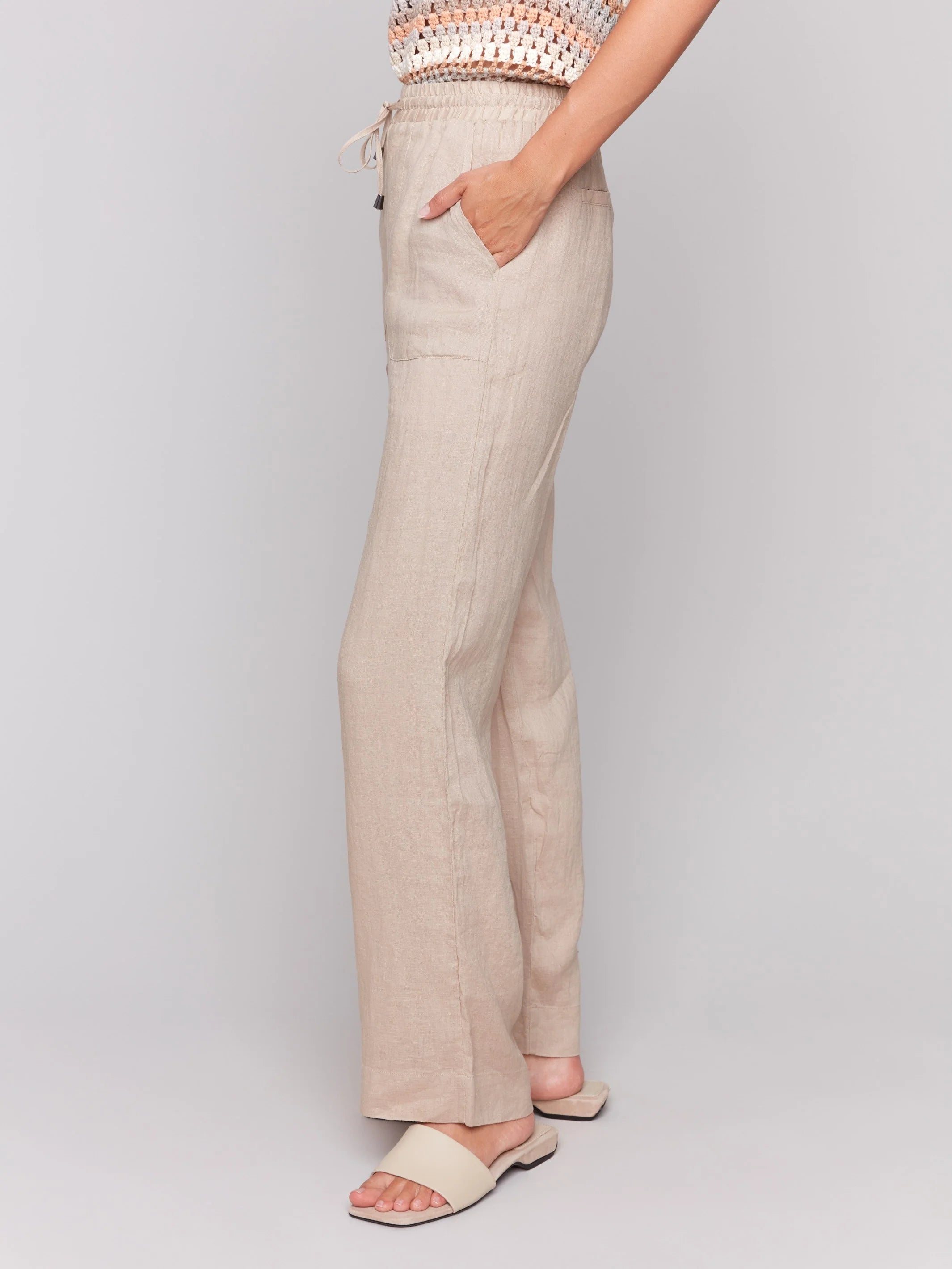 Enjoy easy style with these pull-on wide leg pants. Crafted from a light linen blend, they're ideal for sunny days or relaxed weekends. The adjustable front tie waistband and utility pockets bring both practicality and charm to this classic biscuit-coloured design. Just slip them on and head out looking great this spring!