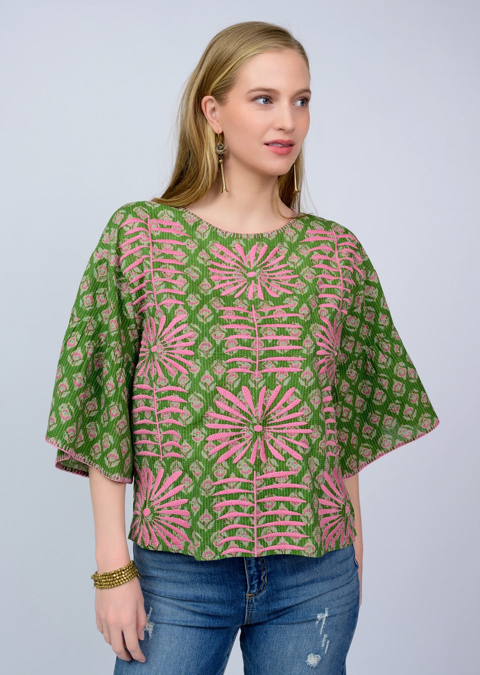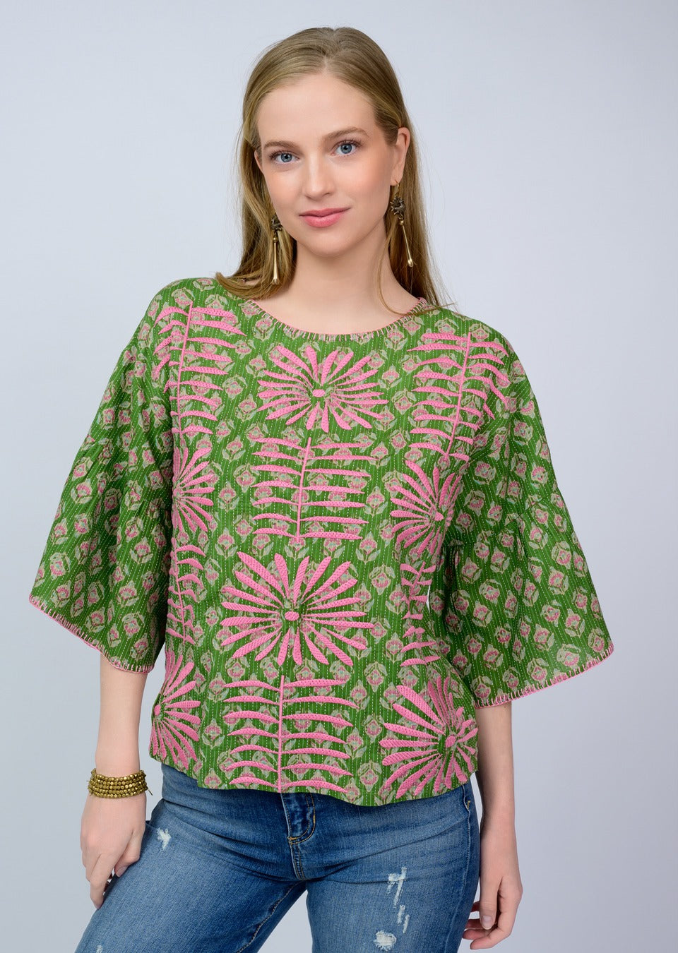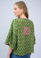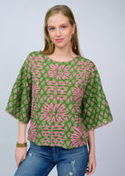 Embrace effortless style with the Sister Mary Elena 3/4 Sleeve Cropped Tunic, a playful and flattering choice that flows beautifully on any figure. Featuring a charming green and pink palette, it captures the perfect fall vibe while doubling as an ideal travel companion. Lightweight yet versatile, this blouse is your go-to transition piece for moving seamlessly between seasons with a touch of fun and flair.
