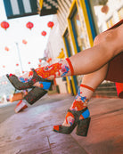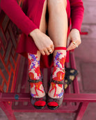 Step boldly into Lunar New Year with our Year of the Horse Sheer Crew Sock — a vibrant celebration of movement, confidence, and good fortune. Designed to honor the Year of the Horse, this striking sheer style features a mirrored horse motif woven in rich red and gold tones, reminiscent of the red envelope. Delicate pink florals and cobalt-blue accents add a feminine layer, all set against sheer beige fabric that allow the colors to shine. Finished with a red cuff and toe and blue heel, this sock turns footwear into a statement.