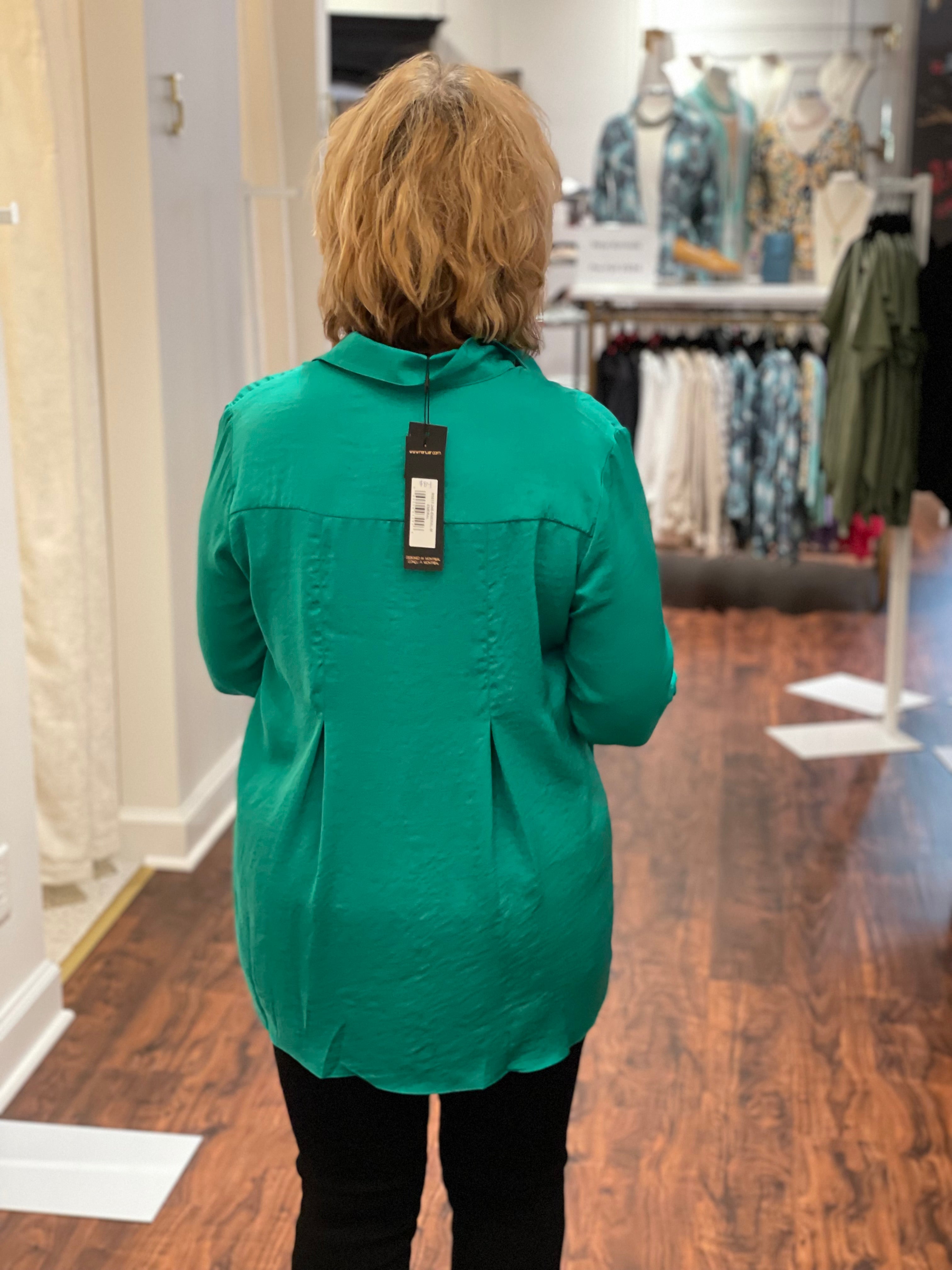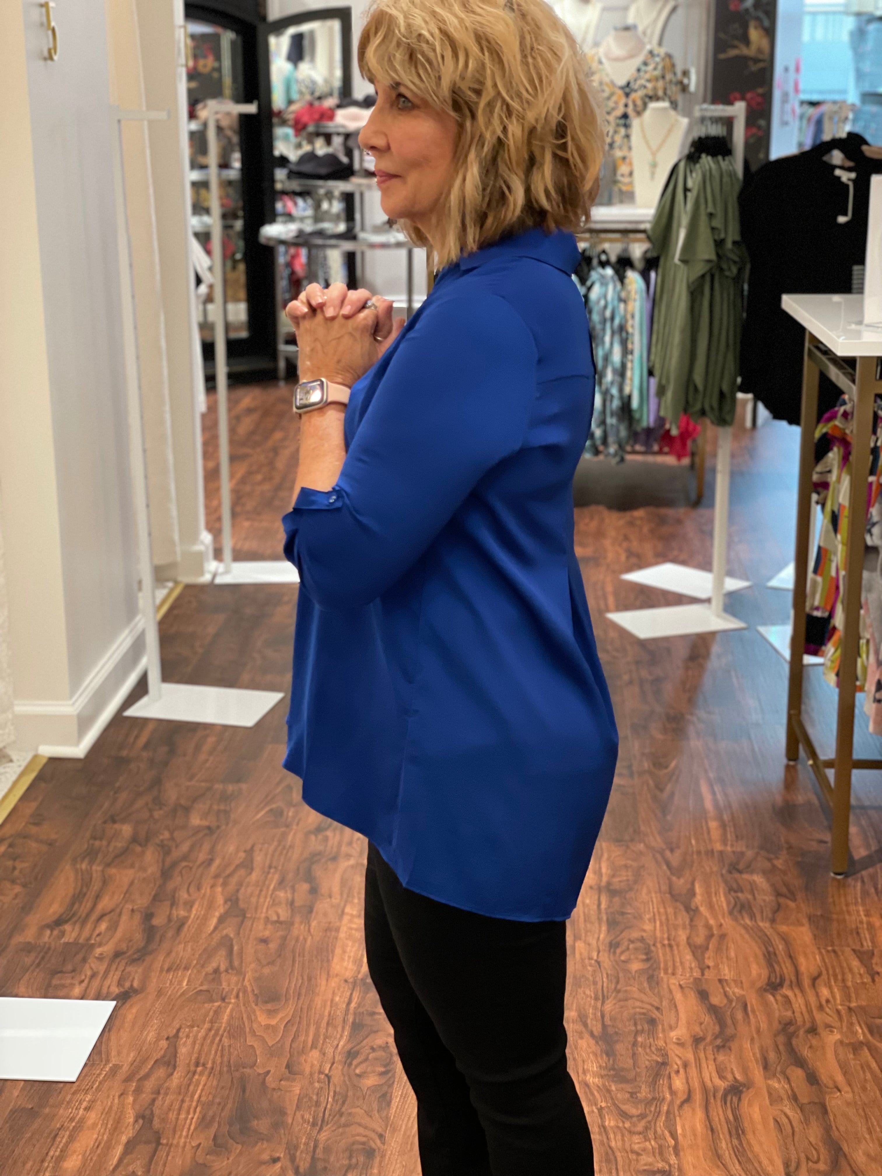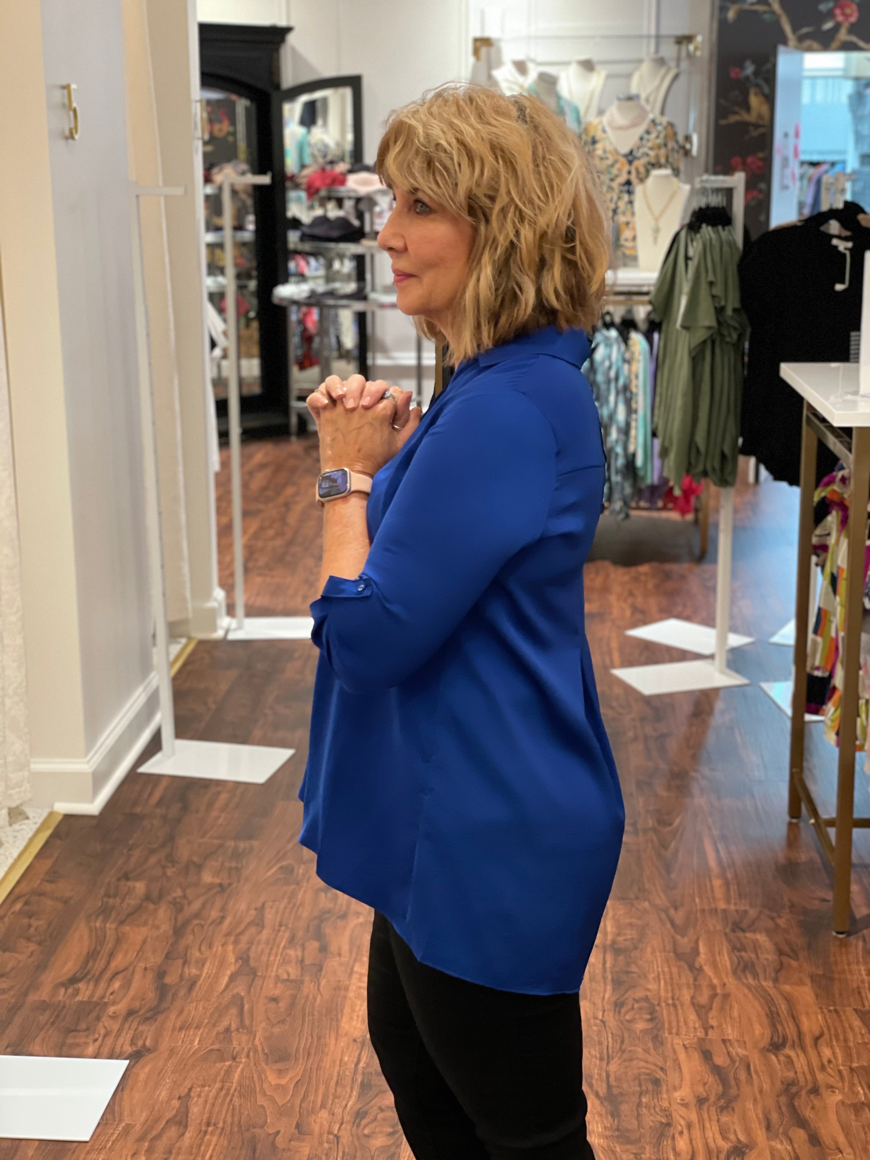 Renuar's Airflow Blouse is suitable for the office and beyond. Lightweight and airy, this breezy top features 3/4 length sleeves, a V-neckline with a hidden 2-button placket, and a flattering high low hem.