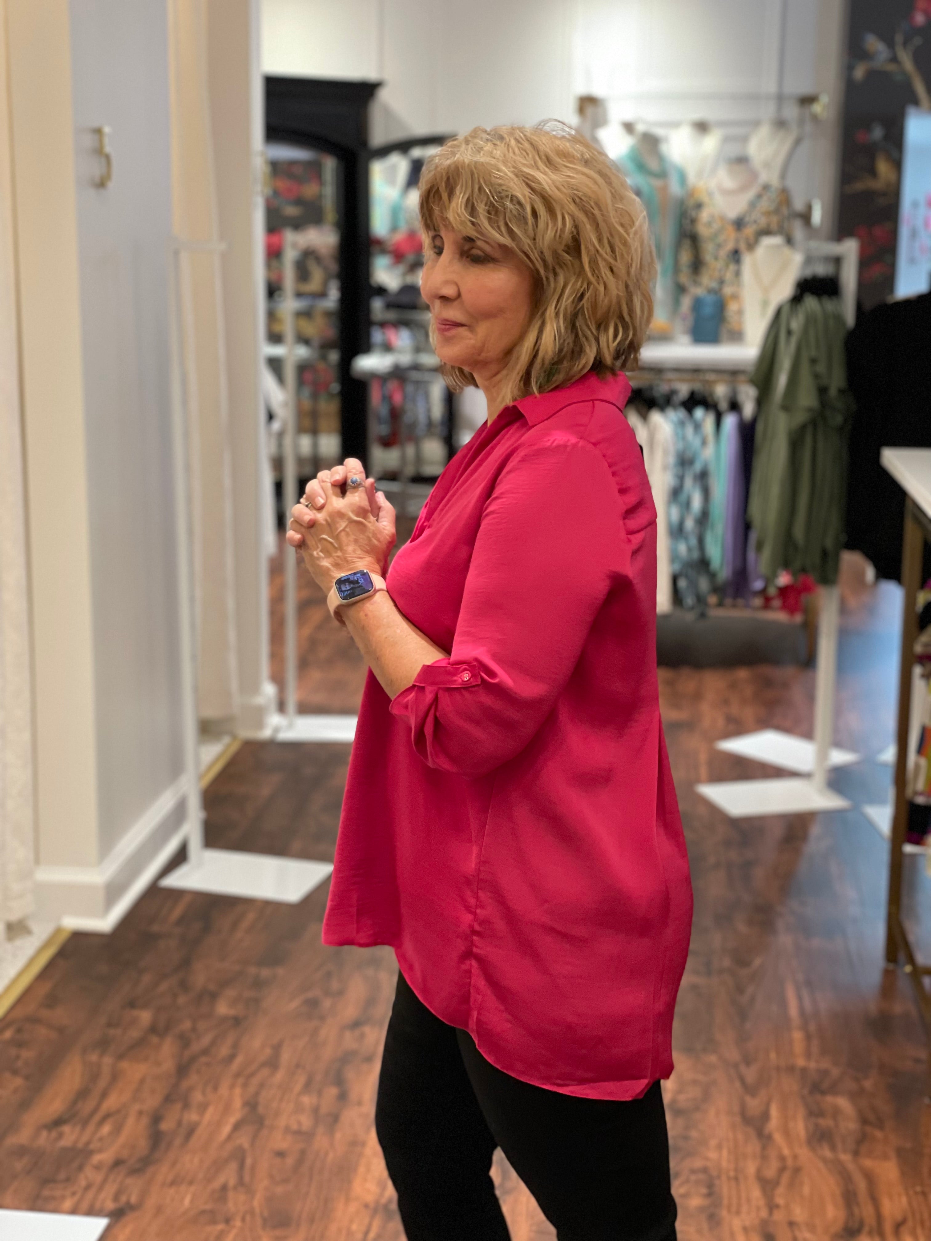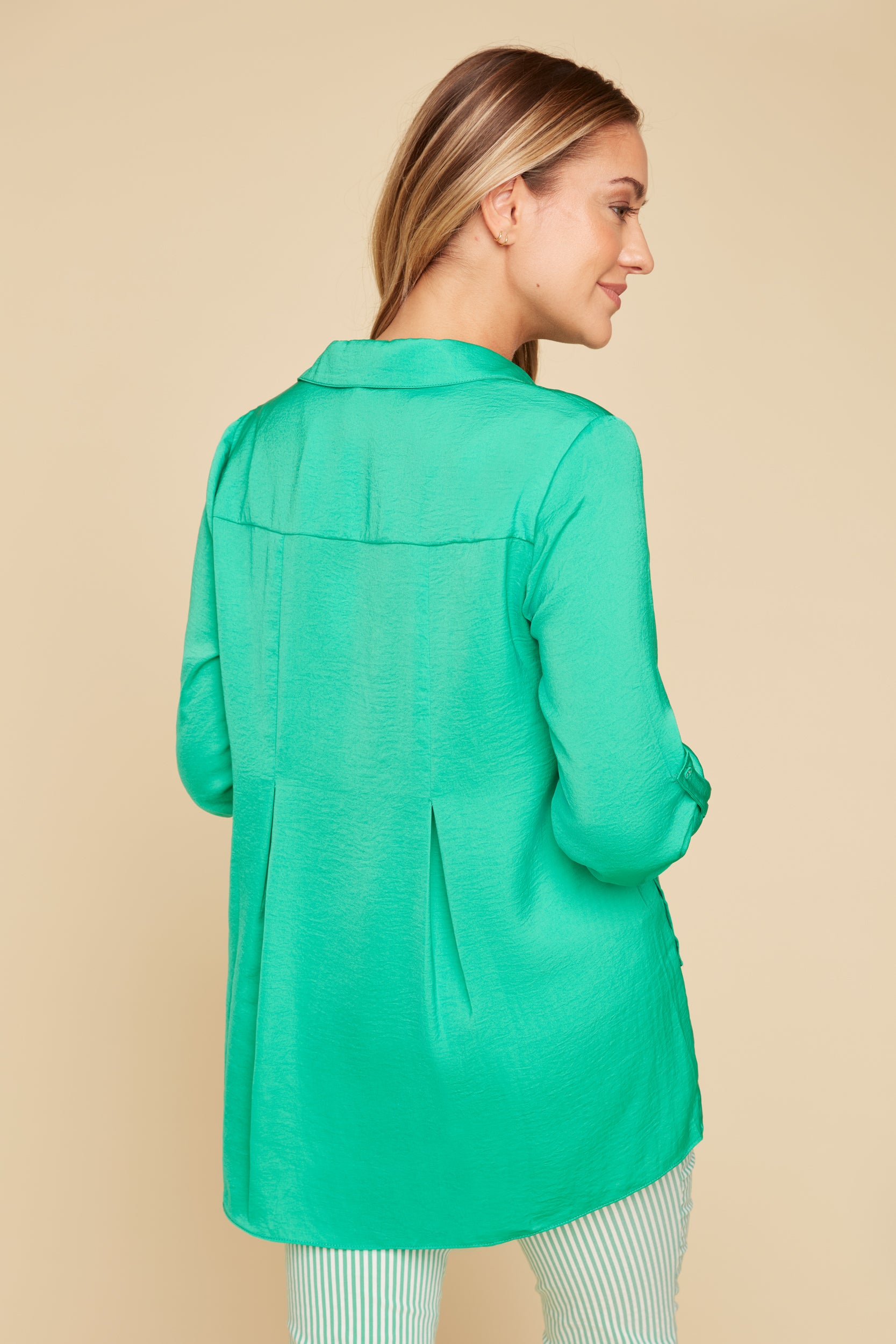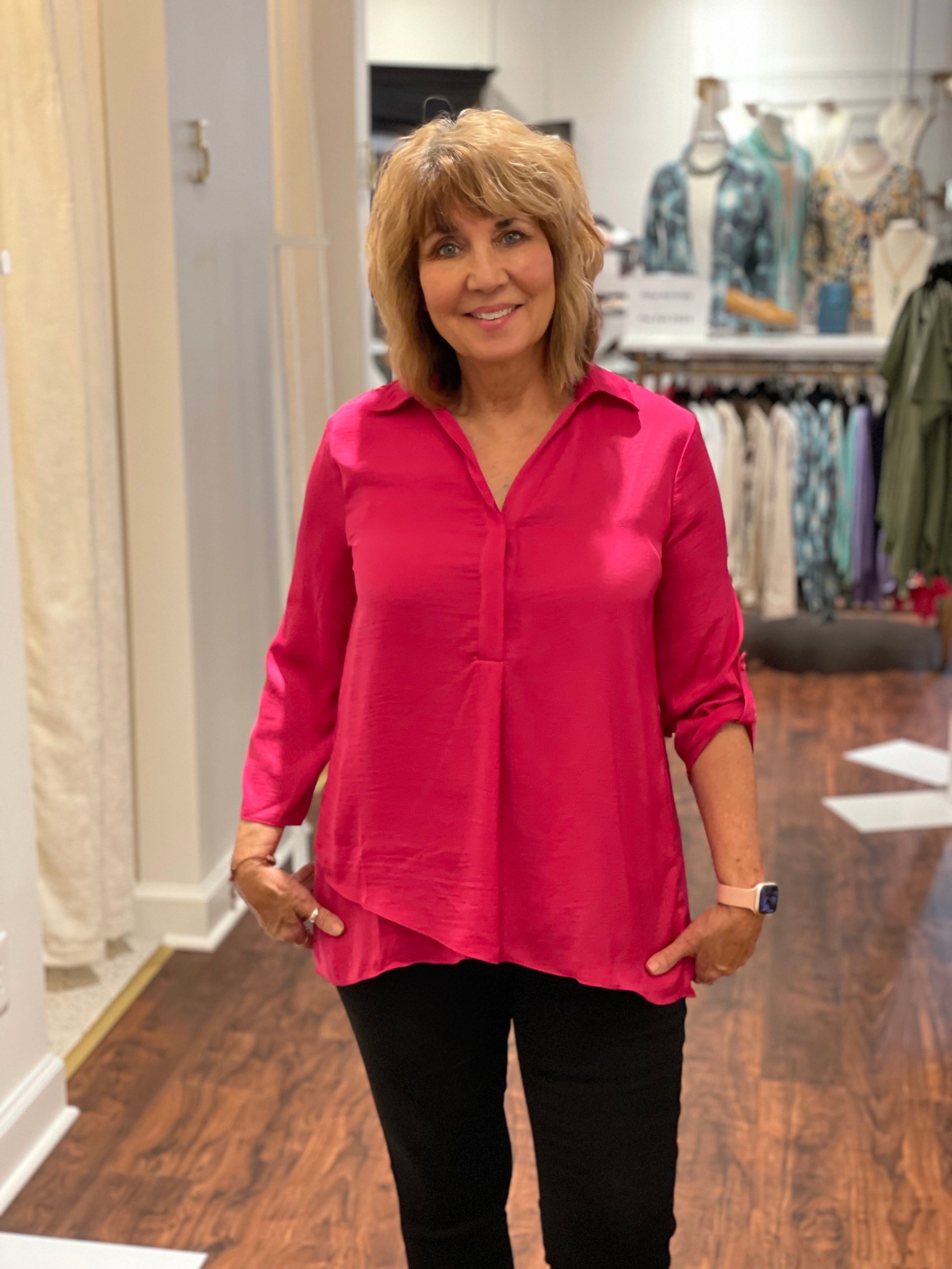 Renuar's Airflow Blouse is suitable for the office and beyond. Lightweight and airy, this breezy top features 3/4 length sleeves, a V-neckline with a hidden 2-button placket, and a flattering high low hem.