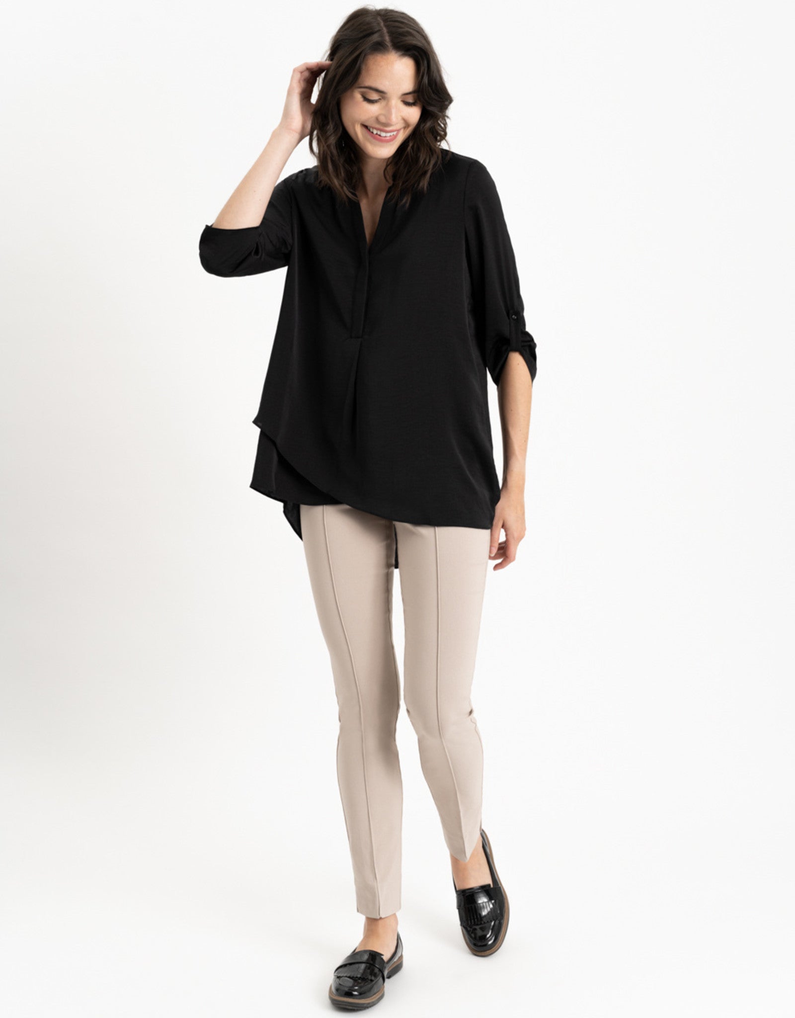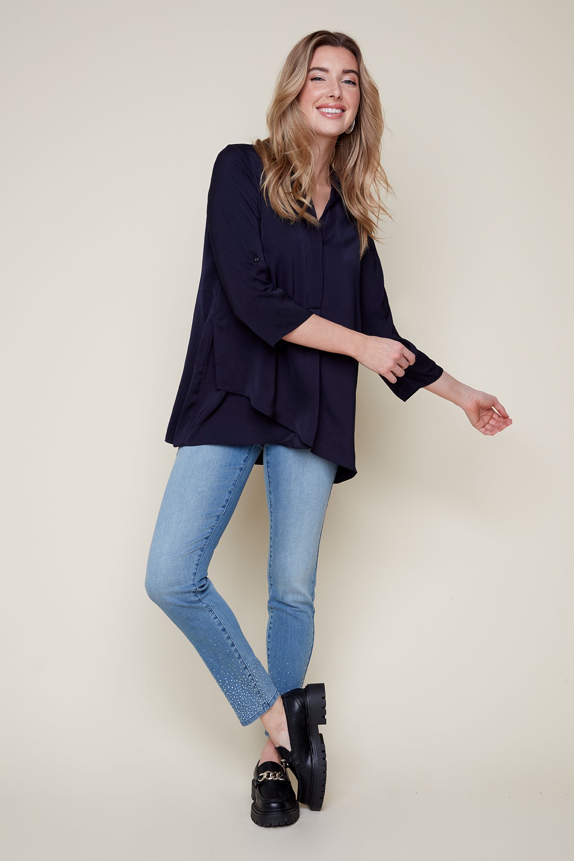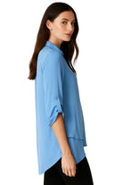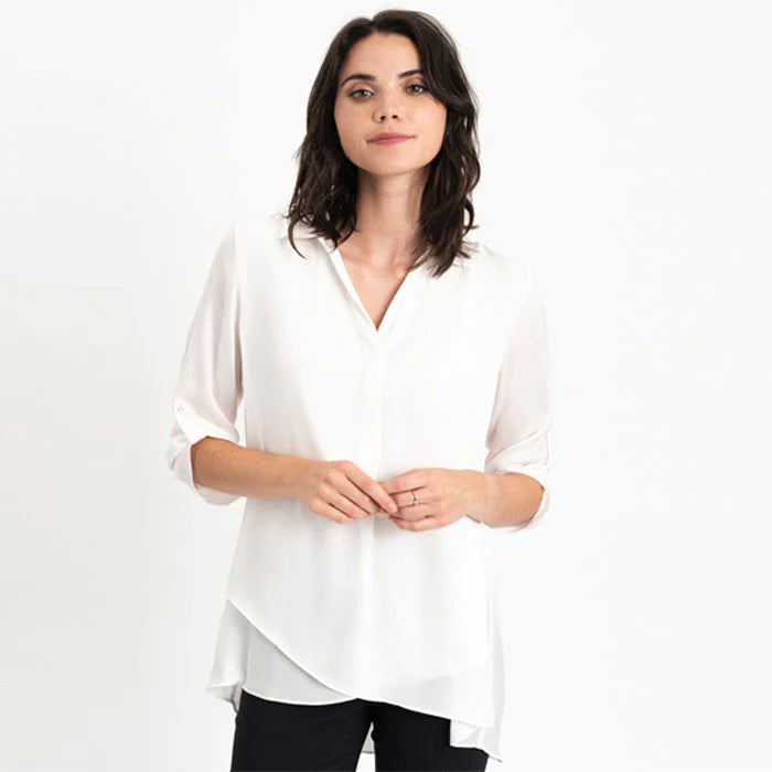 Renuar's Airflow Blouse is suitable for the office and beyond. Lightweight and airy, this breezy top features 3/4 length sleeves, a V-neckline with a hidden 2-button placket, and a flattering high low hem.