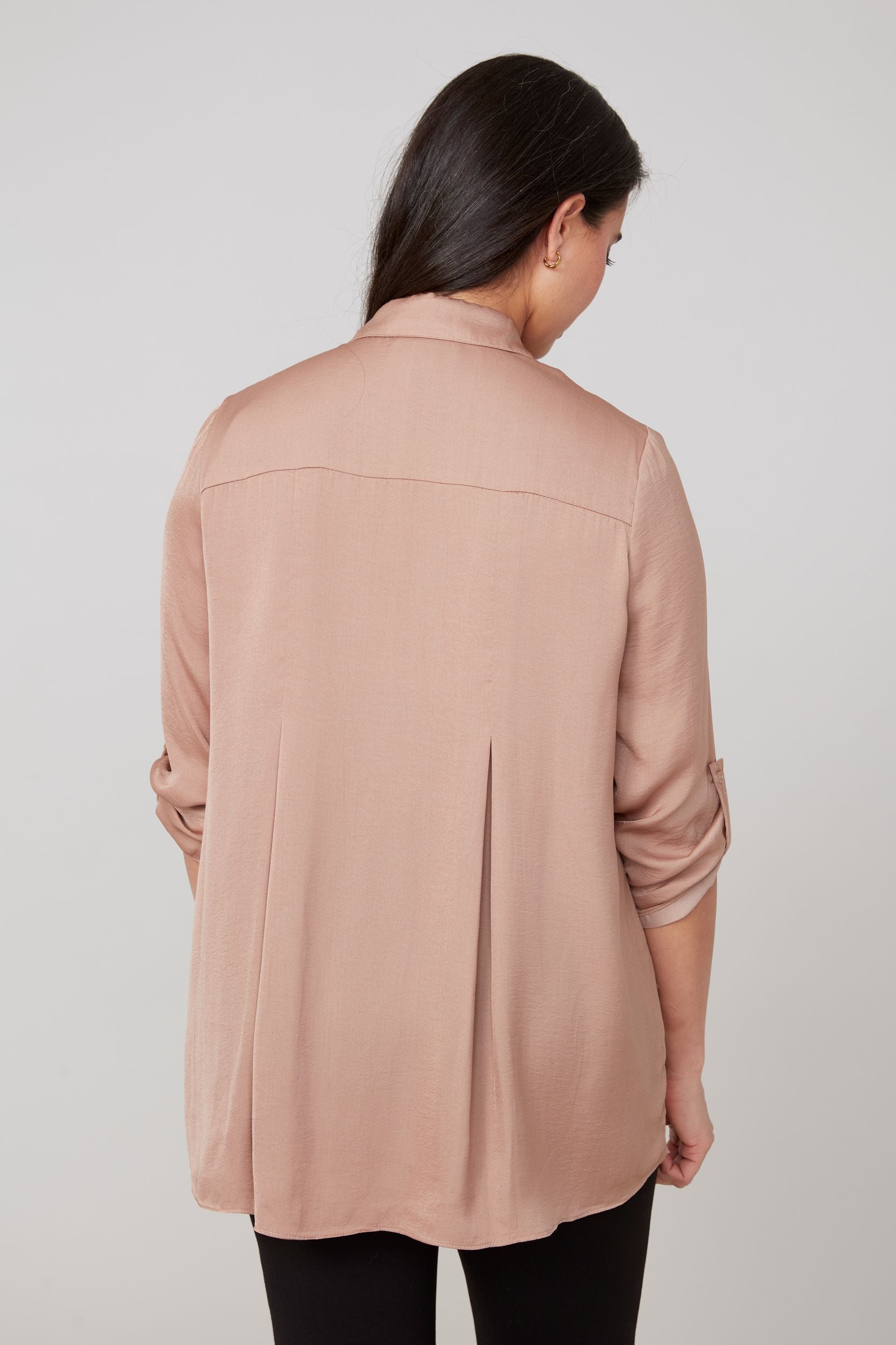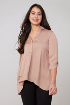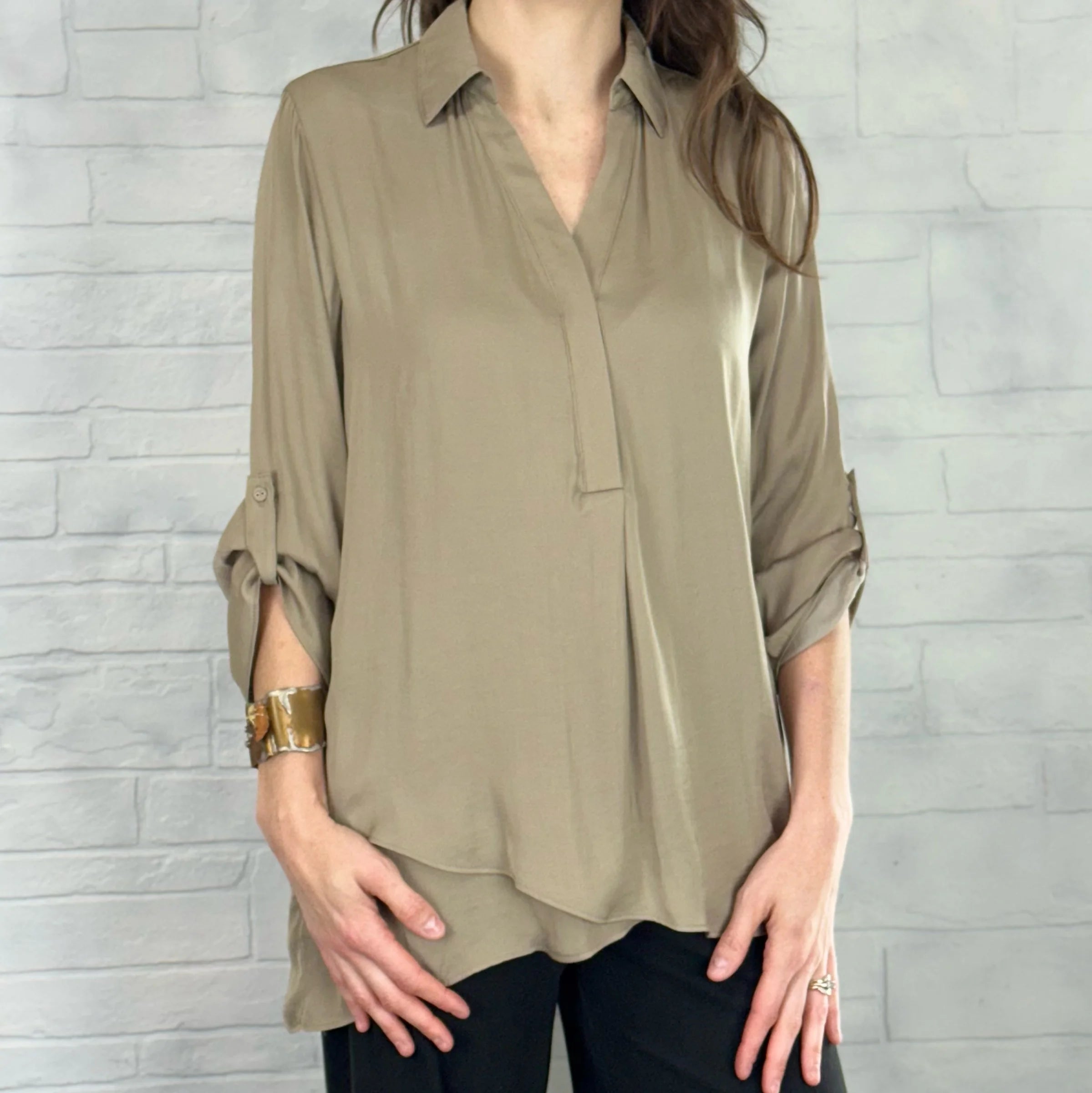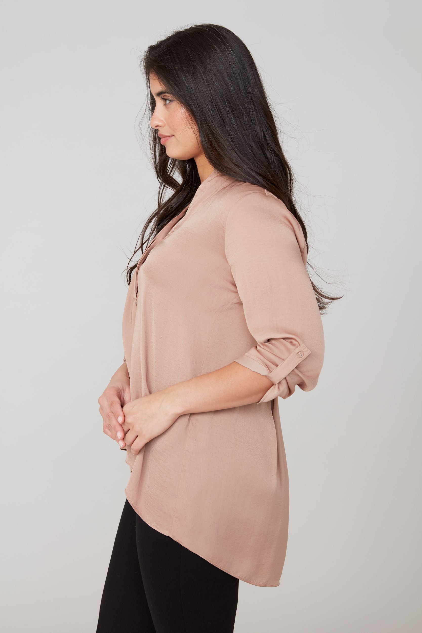 Renuar's Airflow Blouse is suitable for the office and beyond. Lightweight and airy, this breezy top features 3/4 length sleeves, a V-neckline with a hidden 2-button placket, and a flattering high low hem.