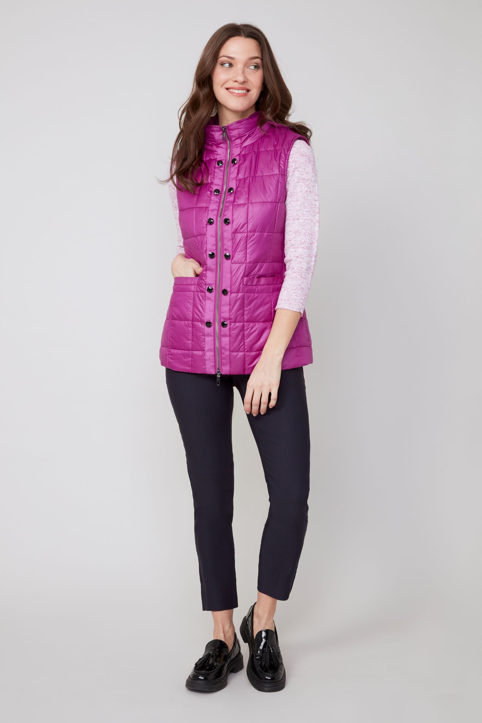 Stay cozy and chic with the Renuar R3907L Luxe Quilted Puff Hooded Vest! Featuring a full zip front and playful black faceted rhinestones adorning the placket, this vest sparkles with personality. Two front pockets trimmed with tonal ribbon add charm and practicality, while a hidden zip compartment tucks away the hood whenever you need a stylish switch-up. Made of 100% polyester, it’s easy to care for—just machine wash cold and hang to dry. Perfect for adding a touch of sparkle to your everyday adventures!