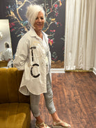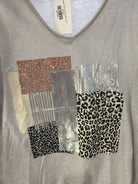 This playful V-neck tee features 3/4 length sleeves and a comfy one-size design that fits XS to Medium. Perfect for adding a fun, casual vibe to your wardrobe with effortless style and a relaxed fit.