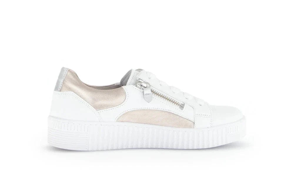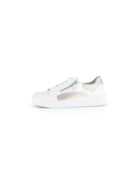 Step into sophistication with the Gabor 3.330 Cervo Sneaker. This luxurious white sneaker features a side zipper and gold metallic detail for added elegance. Experience the perfect fusion of art and fashion with this stunning sneaker, perfect for any occasion.