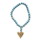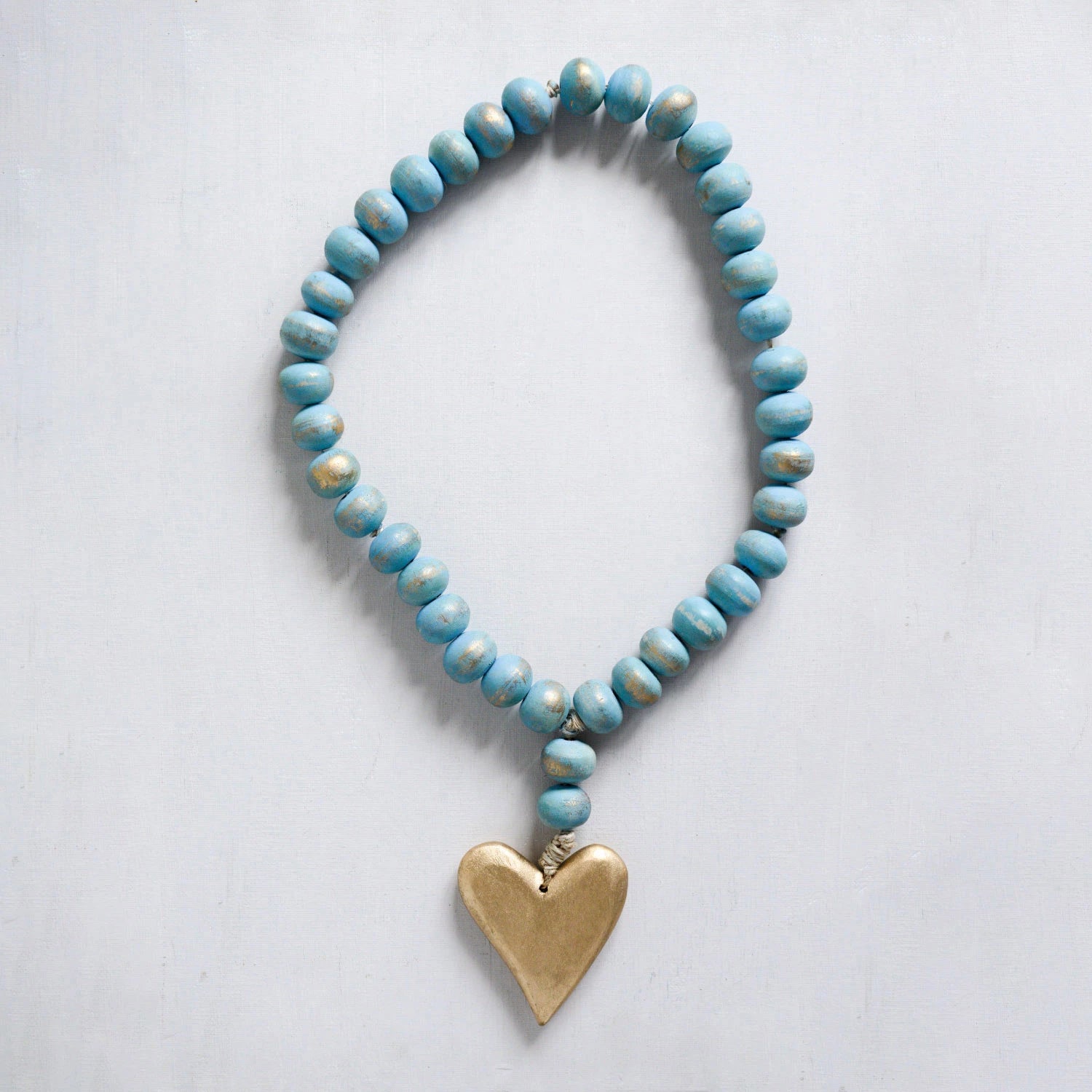 This large decorator piece has a gold heart hanging from a chain of mango wood beads. The beads are aqua with gold distressing throughout. Drop: 4"; Heart: 4" x 3"; Beads 1".